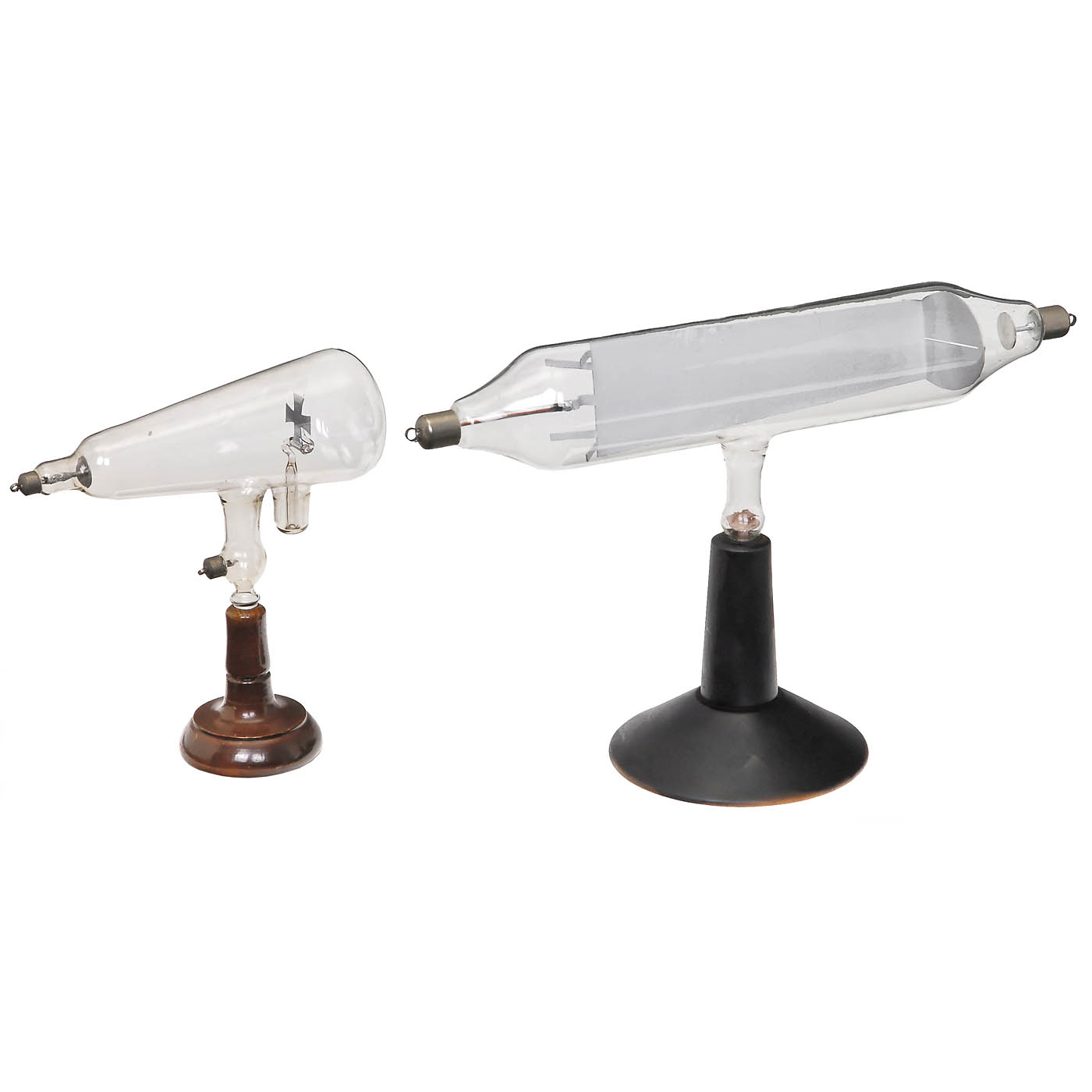 1) Maltese cross tube with forward-tipping cross, length 6 ¼ in., on stand. - 2) Cathode ray deflection tube, used to demonstrate the influence of a magnetic field on the electron beam, length 12 in., on stand. - 3) "Railway" tube, with turning paddle wheel, length 11 ¾ in. - 4) Tube with minerals and shells, used to demonstrate fluorescence, length 9 in., on stand. - And: 5) High-voltage Puluj tube, to demonstrate the influence of a magnetic field on the electron beam, length 8 ¾ in, on stand.