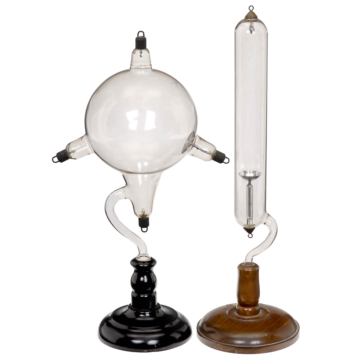 1) "Maltese Cross", cathode ray tube with aluminum cross inside the tube, designed to flip down, 12 ½ in. wide. - 2) Cathode ray tube according to Crookes, showing cathode rays being emitted from the cathode and traveling to the 3 anodes, height 14 1/5 in. - 3) Vacuum tube with cylindrical cathode, height 15 3/5 in. - And: 4) X-ray air-cooling tube with regeneration device, length 15 ¾ in.