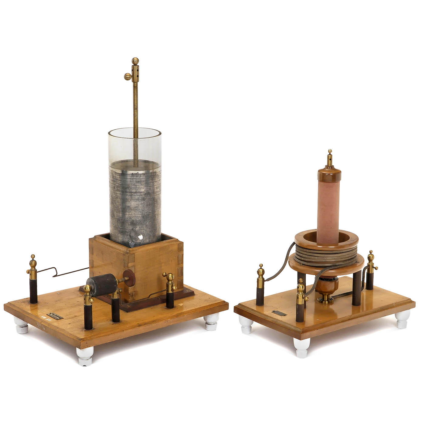 With maker's plaques "Franz Steflitschek - Mechaniker - Wien VI. Millergasse 8.", the apparatus consists of: 1) High-tension transformer according to Elster and Geitel, 14 1/5 x 9 ½ in. - And: 2) Spark-micrometer with zinc points and Leyden jar, 12 ½ x 16 ½ in. - Both on polished oak bases with isolating porcelain feet.