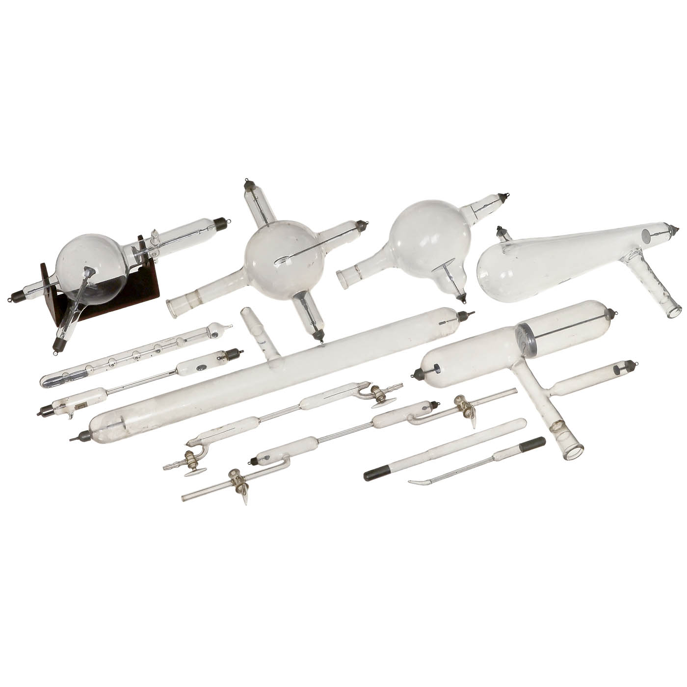 Physical demonstration models and others: 5 various Crookes cathode ray tubes, 1 x-ray tube (defective), 15 glass valves, 4 stands, 3 Leyden jars, 2 glass tubes with mercury, 1 rotating mirror, 2 vacuum measuring instruments by Prolabo, Paris, with mercury, 6 various lenses for optical banks, in wood case, 1 chrome-acid cell in case, further parts. - Collection only. Shipping not possible due to the mercury.