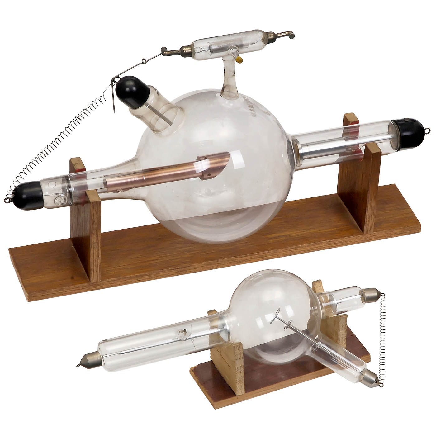 1) "Mammoth" X-ray air-cooling tube with regeneration device, made by Cuthbert Andrews, England, length 20 in. - 2) Crookes cathode ray tube, for demonstrating the influence of an electric field on the electron beam, on wood base, length 11 3/5 in. - 3) Cathode ray tube according to Crookes, showing cathode rays being emitted from the cathode and traveling to the 3 anodes, height 13 in. - 4) X-ray tube, made probably by Rudolf Pressler, Cursdorf, length 13 in. - And: 5) "Maltese Cross", cathode ray tube with aluminum cross inside the tube, designed to flip down, 12 ½ in. wide.