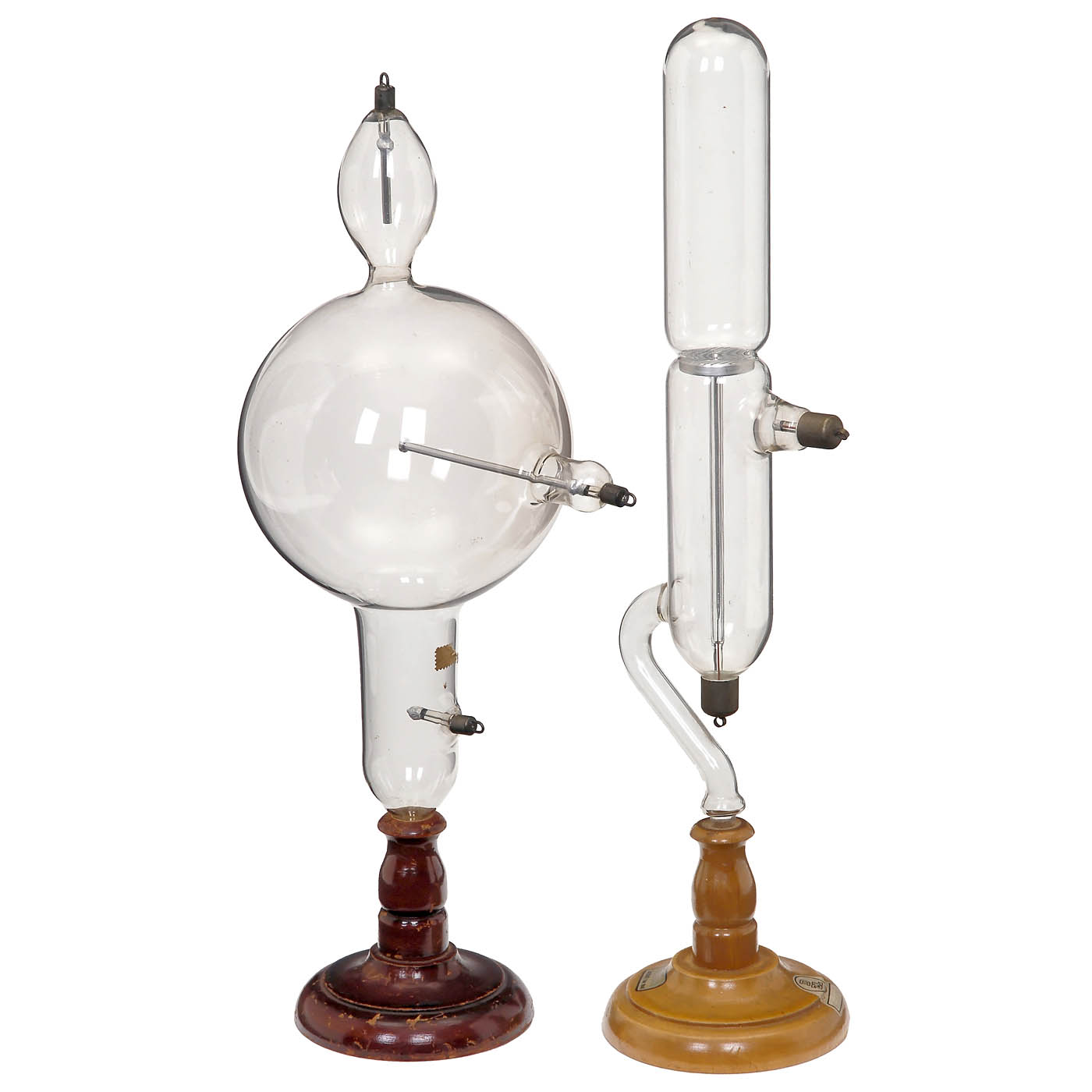 1) Canal ray tube after Goldstein, made by by Rudolf Pressler, Cursdorf, Germany. Height 13 in. - 2) Vacuum bulb with Tesla vacuum, height 12 ¼ in. - 3) X-ray tube, with regeneration device in shape of a small active carbon ball, made by Rudolf Pressler, Cursdorf, length 13 in. - 4) Crookes paddle wheel tube, 11 in. wide. - And: 5) X-ray tube, without regenerator, length 9 7/8 in.