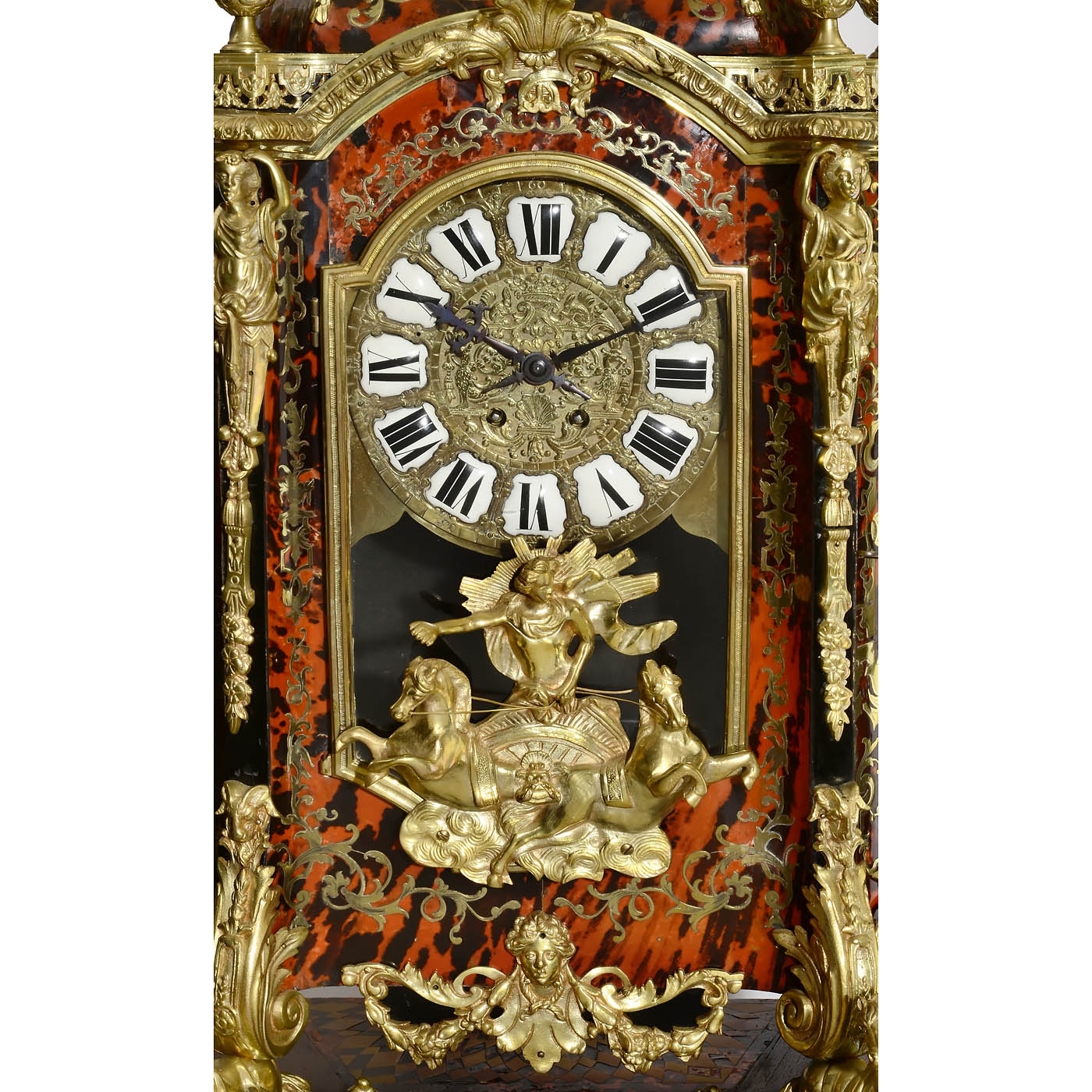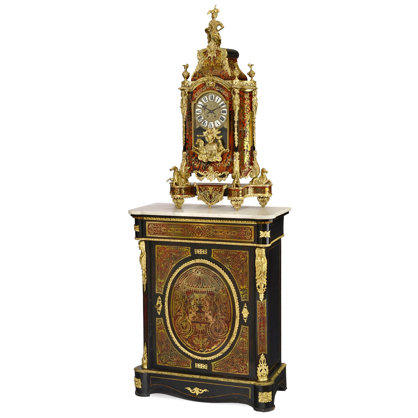 In the style of the Second Empire, with 1 front door, case finely inlaid with tortoiseshell and cut brass, decorated with gold-plated brass applications, white marble cover plate, dimensions 32 1/3 x 14 ½ x 41 in. - Two-train pendulum clock, half-hour strike on bell, cast brass 7 ½- inch dial, Roman numerals in enamel cartridges, housing decorated in the same style as the cabinet, applications consisting of 4 resting horses, sun king in a triumphal carriage, tendrils with ram's heads, columns in the form of female torsos, 4 urns and female sculpture with large-leaved headdress on top, total height of the clock 44 in. - An impressive ensemble.