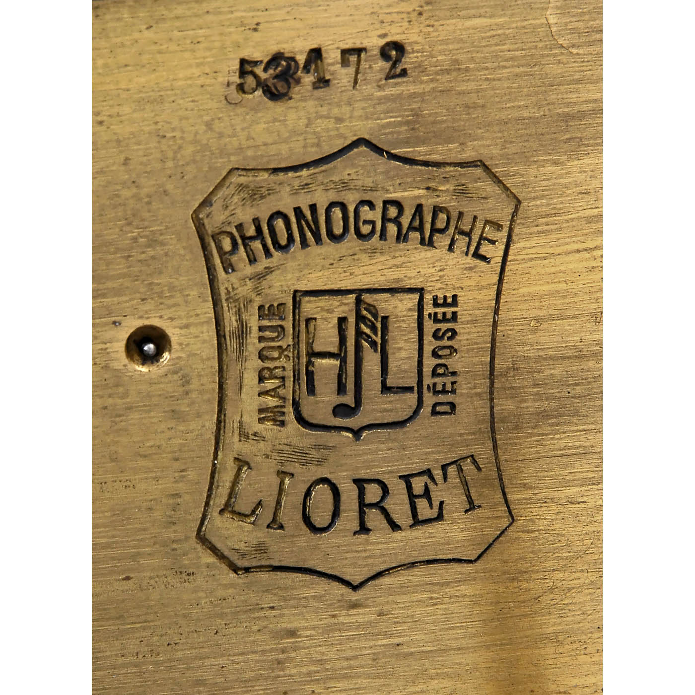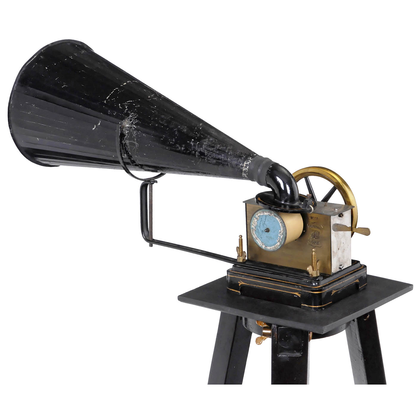 Rare French weight-driven phonograph for celluloid cylinders. Inventor and manufacturer was the Parisian clockmaker Henri Lioret (1848-1938). Nickel-plated brass case with stamp, serial no. 53172. Original reproducer and horn, on tripod. Including 3 Lioret celluloid cylinders and two transport boxes (period but not original). - Perfect original playing condition! - A milestone in phonograph history and an essential exhibit for any collection.