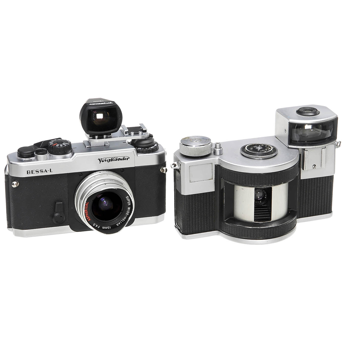 1) Voigtländer (Cosina, Japan). Bessa L, 24 x 36 mm, no. 00010306, with M39 mount, Super-Wide-Heliar 4,5/15 mm Aspherical, LED light meter, with double-shoe adapter and viewfinder 15 mm, cap. With original box. (2/2) - And: 2) USSR. Horizont, 1970, panorama camera 24 x 58 mm, 1/30-1/250 sec. With grip and viewfinder. Shutter sounds well. With case. (3/3)