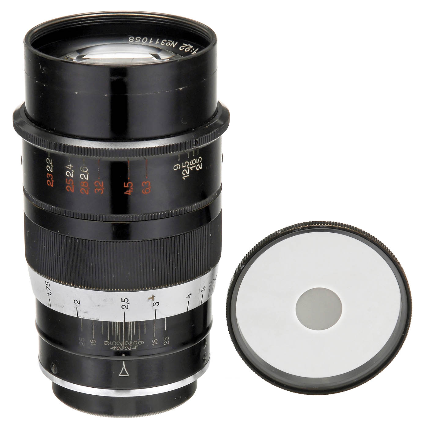 Leitz, Wetzlar. No. 311058, the legendary soft-focus lens, early aperture scale, meter scale, with the famous filter with silvered central spot to control the soft-focus effect, with rear cap. A very rare soft lens for romantic portraits. Reasonable condition, glass very clean. A real lens for users!