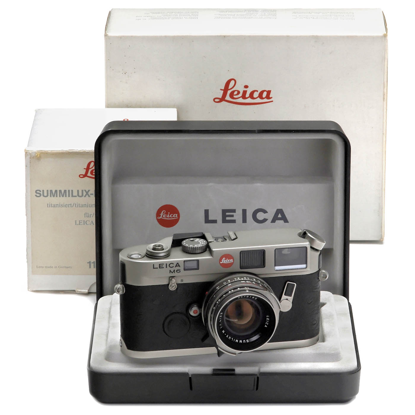 Leica Camera GmbH, Solms. Titanium-plated Leica M6, no. 2002870. With body cap, instructions, warranty card, presentation case and box. Summilux-M 1,4/35, no. 3570185, with back cap, case, warranty card and box. The camera is almost too good to use, but then again, included is a sturdy "Leitz Wetzlar" black leather fitted case.