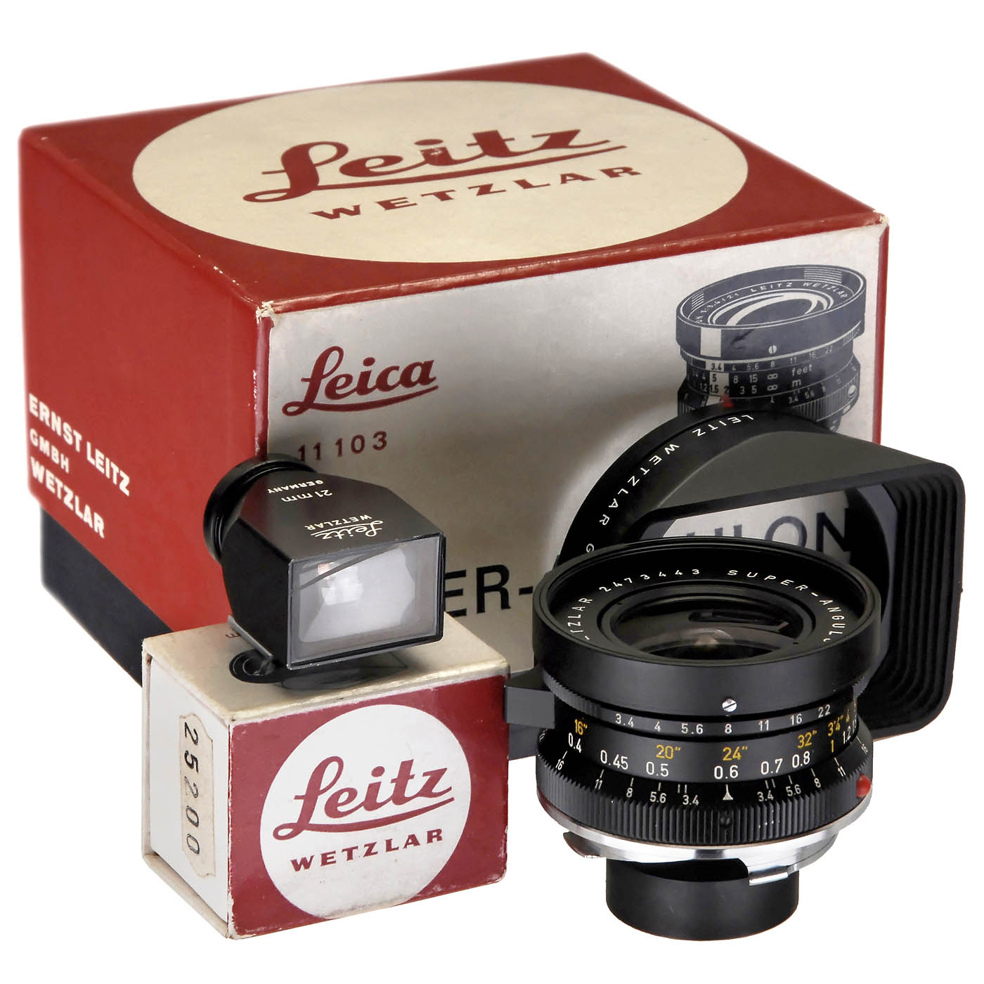 Leitz, Wetzlar. 1) Super-Angulon-M 3,4/21, no. 2473443, lens body loose in mount, otherwise good condition! With hood 12501, both caps and original matched box. (3/3-) - And: 2) Viewfinder 21 mm SBKOO/12002, black chrome. Viewfinder shows little sign of use, front element cracked. With box. (2-/4)