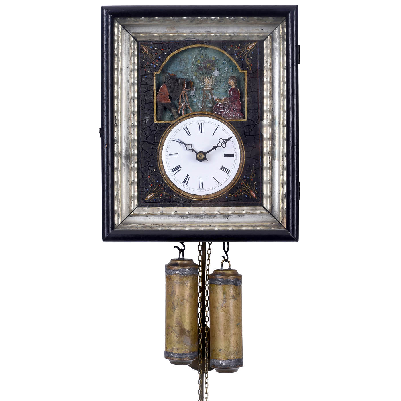 Picture-frame clock, enameled dial, hand-painted arch, wood-plate movement, brass gears, weight-driven, camera with moving lens, coupled with pendulum, hour-strike on spiral gong, coupled with moving lime light, minor flaking on reverse-painted glass, the movement halting.
