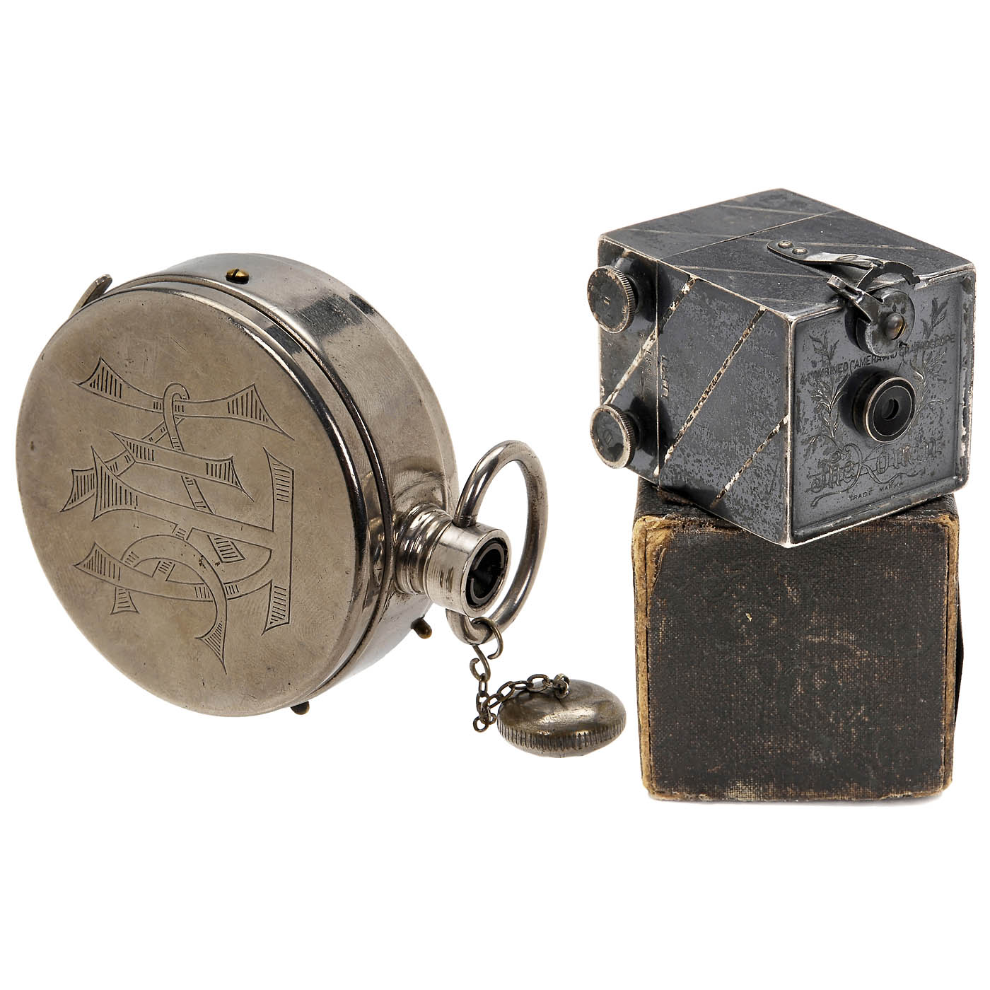 1) Alfred C. Kemper, Chicago. The Kombi, "A Combined Camera and Graphoscope", metal body no. 11531, for 25 circular photographs of 1 1/8 in., meniscus lens, rotating shutter I + T, with original box. Very decorative camera. (3/3) - And: 2) Houghton's Ltd., London. Ticka, for 25 photographs of 16 x 22 mm on special cassette, meniscus lens, shutter I + T, chrome-plated version, with lens cap and cassette. (3+/-)