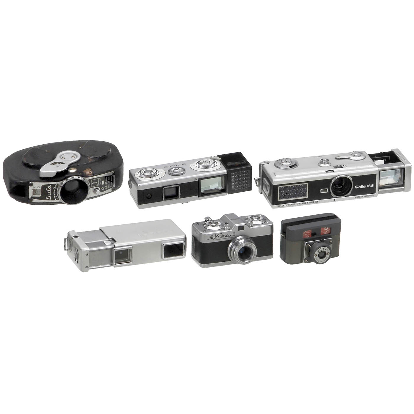 1) Meopta, CSSR. Mikroma II, c. 1959, green leather. - 2) Durst, Italy. Duca, c. 1946. 24 x 36 mm on Agfa-Karat cassettes. - 3) Daito, Japan. Petit, c. 1967, 14 x 14 mm on "Mycrosized rollfilm". - 4) Wirgin, Wiesbaden. Edixa 16 with exposure meter, c. 1962. - 5) Franke & Heidecke, Braunschweig. Rollei 16S, c. 1968. Shutter inactive. - And: 6) Minolta, Japan. Minolta-16, c. 1957. - Mixed condition, most good.