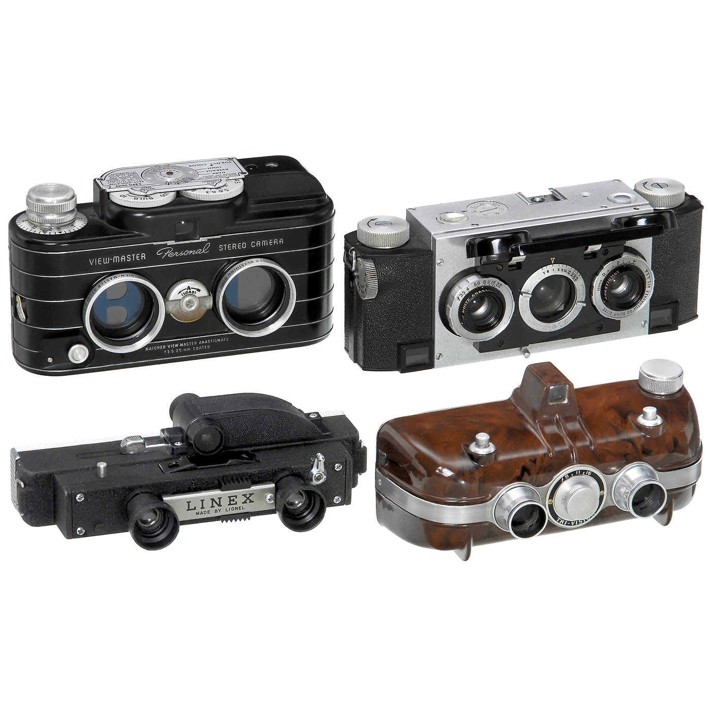 1) Sawyer's Inc. Portland. Viewmaster-Personal no. 7566, format 11 x 12 mm on 135 film, Viewmaster Anastigmat 3,5/25 mm, shutter B, 1/10-1/100 sec. (3+/2-) - 2) White, Milwaukee. Stereo Realist, 24 x 23 mm on 135 film, David White Anastigmat 3,5/35 mm, shutter T, B, 1-1/150 sec., rangefinder de-adjusted, otherwise: (2-/3) - 3) Lionel, New York. Linex, 16 x 20 mm on 16mm film, simple shutter, lenses 8/30 mm. (2-/3) - And: 4) Haneel, Alhambra. Tri-Vision, 26 x 27 mm on 828 film, brown bakelite, elegant design, simple shutter. (3/-)