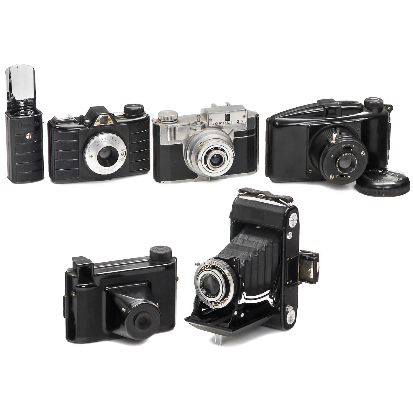 1) Neo-Fot, rare Danish 4,5 x 6 cm bakelite rollfilm camera, c. 1948. Viewfinder glass missing, with case. - 2) M.I.O.M., France. Photax III, c. 1950, bakelite rollfilm camera 6 x 9 cm, with cap (repaired). - 3) Kamerafabrik, Monheim. Blitz-Hexi, c. 1956, bakelite rollfilm camera 6 x 6 cm, a.k.a. "Reporter Blitz-Max". With flash and case for both. - 4) Zeiss Ikon, Dresden. Nettar 515/2, Nettar-Anastigmat 4,5/10,5 cm in Compur, with Zeiss Ikon viewfinder 433/2. - And: 5) Bencini, Italy. Koroll 24, c. 1953, 120 film for 3 x 4,5 cm.