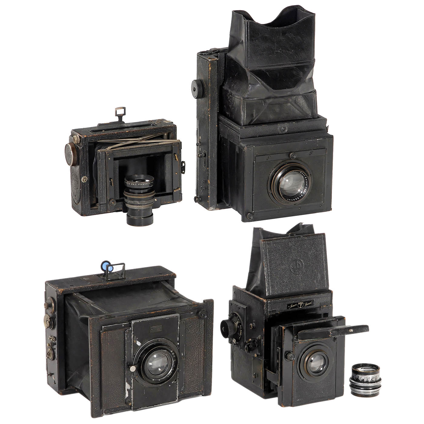 All with focusing screen back. 1) Zeiss Ikon, Dresden. Nettel 9 x 12 cm, cloth good, works, Contessa Nettel focusing screen back for thin paper cassettes (Hemera), scale for Tessar 15 cm and Tele-Tessar 25 cm, without lens board. (4/3) - With Tele-Tessar 6,3/25 cm. (4/4) - 2) Goltz & Breutmann, Dresden. Mentor folding-reflex 10 x 15 cm, cloth good, works only intermittently on "Z" setting, Tessar 4,5/21 cm in normal mount instead of 4,5/16,5 cm in helicoid mount. (3/3-) - 3) Thornton-Pickard, England. Junior-Special, Reflex for 6 x 9 cm, cloth dry, works intermittently, with 2 appropriate lenses: Cooke Anastigmat 4,5/5 in. and Ross Homocentric 4,5/155 mm 6 1/8 in., coated and clean. (3/-) - And: 4) Goerz, Berlin. Ango 12 x 16,5 cm. (5/-) - With Celor 4,5/180 mm, glass sufficient. The Celor would make a suitable replacement lens for Mentor folding reflex. (3/4)