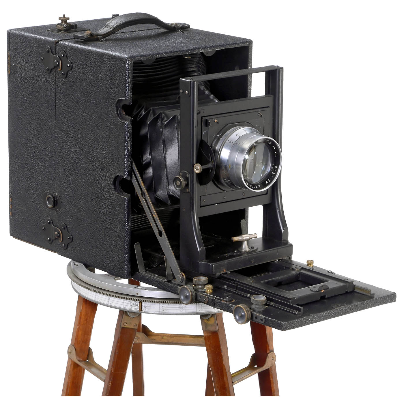 Folmer & Schwing, Rochester. Camera no. 99, for 10-, 8- or 6-inch films. Complete set: with tripod, tripod head, front swing- and tiltable, folding front can be dropped. Version for Kodak Anastigmat Ektar 6,3/12 in., no. 131K (non-convertible lens, sharper in open stops), on baseboard original scale for 131K and the 3 focusing settings, with all gears: 46, 47 and 48, with 2 winding heads and 2 cases. With later prototype of a tilt head where the 3 gears work on extension pieces through an adjustable socket joint depending on angle of inclination. With copy of instructions and 7 unopened films from 1995-2001, 2 x Verichrome Pan film 8 in. x 5 ft., 3 x Vericolor III Professional 10 in. x 6 ft., 1 x Pro 400 Film and 1 x Vericolor 400. With Double-X-Aerographic Film 2405 Sp981 of 9 ½ in. x 250 ft. Enough film material and spools for professional work! - Original outfit in working condition!