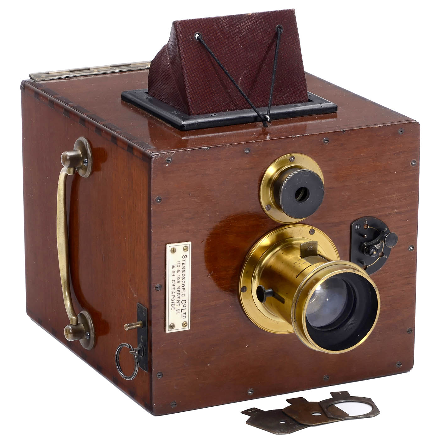 E. Français, Paris. Early twin-reflex camera, polished wood, inside marked "A337", rotary shutter with speed control knob 0, 1, 2 and 3 on front, lens in bayonet mount from E. Français, Paris, no. 17814, with 4 waterhouse stops, 8, 22, 44 and 64, focusable until approx. 3 m, engraved for 100, 15, 10 and 5 m. Reflex lens focusable, viewing screen approx. 48 x 42 mm. Internal storage space for the lens, the waterhouse stops and case and the 3 original double cassettes of 9 x 12. - A well-constructed camera, the dark slide must be pulled down from under the camera and not from above as usual, where the sun will shine into the slit! With dealer's plaque "Stereoscopic Co Ltd". Important collector's item and a real milestone! Sought-after classic camera in beautiful condition!