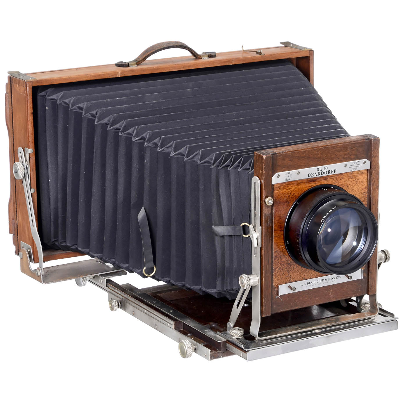 1) Deardorff, Chicago. View Series, no. 2018, only the 7 x 17 in. back with brass fittings. (3/3) - 2) Modern double cassette, stamped "7 x 17 1996 AWB ENT" (2-/2-) - 3) Ilford HP5 Plus, 5 boxes, each with 25 sheet of 7 x 17 in., all unopened. - 4) Schneider Symmar 5,6/360 mm, glass clean. With caps and adapter ring. (3/3) - 5) Docter-Wetzlar-Jena-Germany. Doctar 4,5/360 mm, near-mint, on board. (1-2/2) - And: 6) Great Bassin Photo. Contact printing frame, for negatives up to 19,8 x 50,3 cm. (2/2)