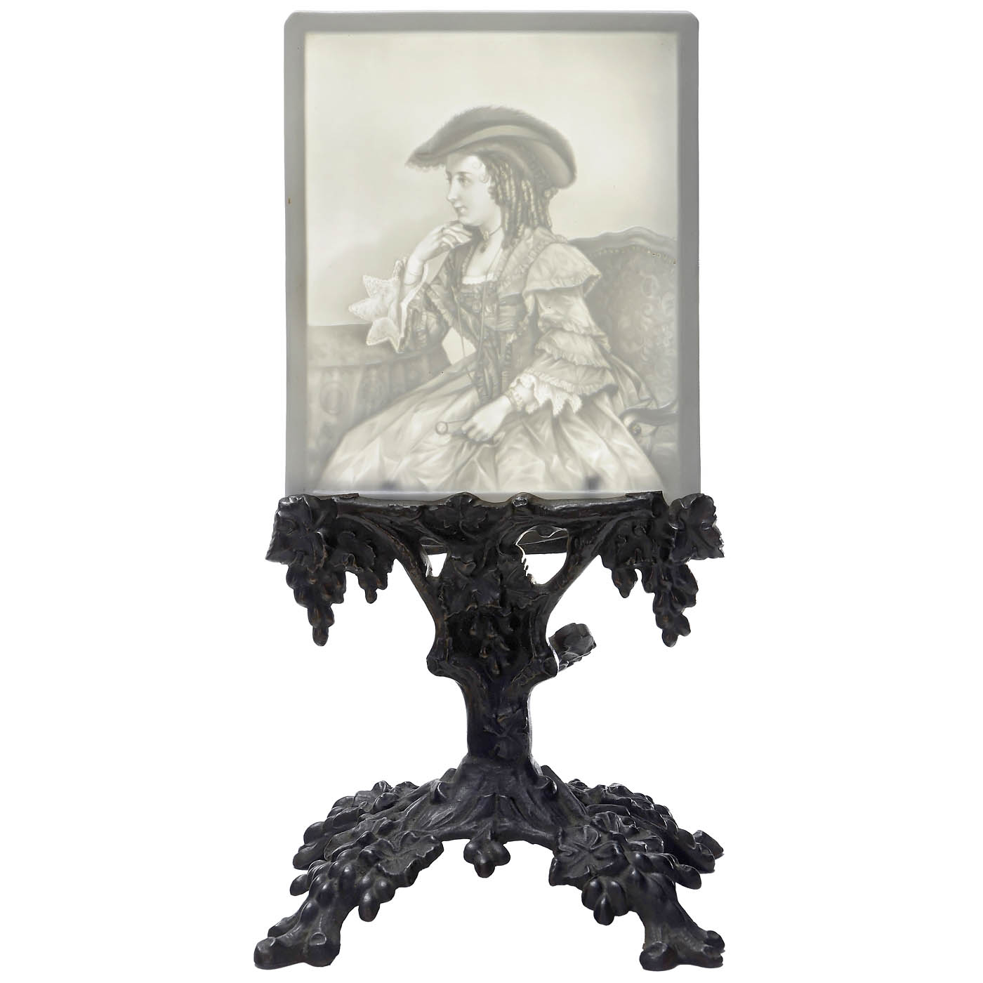 Lithophane stand in cast-iron (probably from Berlin), height 4 1/3 in., swinging candle holder, floral decoration, very decorative. With 2 unmarked, 2,5 mm thick lithophanes on reverse: "1918", with motif of a chamber concert, size 4 ¼ x 4 ¾ in.; and size 4 1/3 x 5 in., marked on reverse "PPM 539", motif: young lady with ringlets, in the style of the 1820s. Beautiful picture!