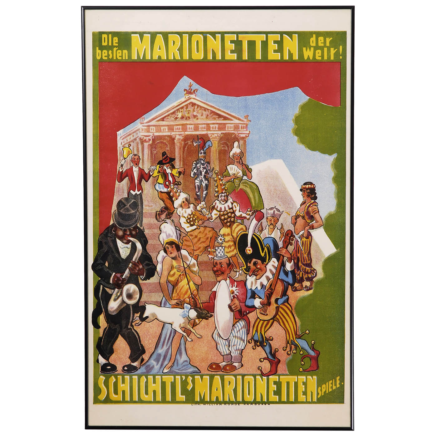 "The best marionettes in the world! " Color lithograph by William Rohde, Hamburg, showing a moving vaudeville scene, dimensions with frame 17 ¾ x 27 ½ in.