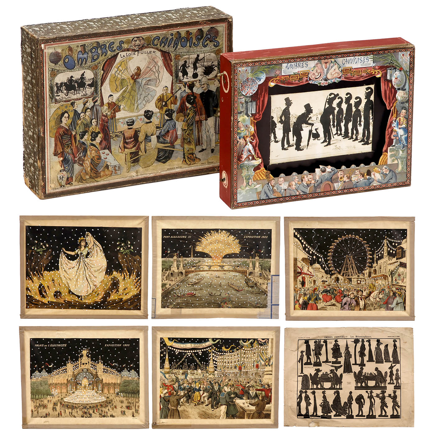Mauclair Dacier, Paris. 20 x 16 x 5 in., with 5 plates, one plate with transparent paper and one removable roll picture. The plates are "La Loie Fuller ou la Danse serpentine", "L'Embrasement du Trocadéro, à Paris", "La réception des Marins français à Péterhof" (1893 French-Russian meeting Dunkerq-Cronstadt), "Le Palais de l'Électricité" (Exposition 1900) and "Le Pont Alexandre III". The roll picture shows 12 humorous sketches, some cracks, roll picture works well. With instructions in cover and an unscissored foil from Pellerin "Ombres Chinoises (5) Les Métamorphoses", among others "Le magicien" and "Gourmands changés en cochons".