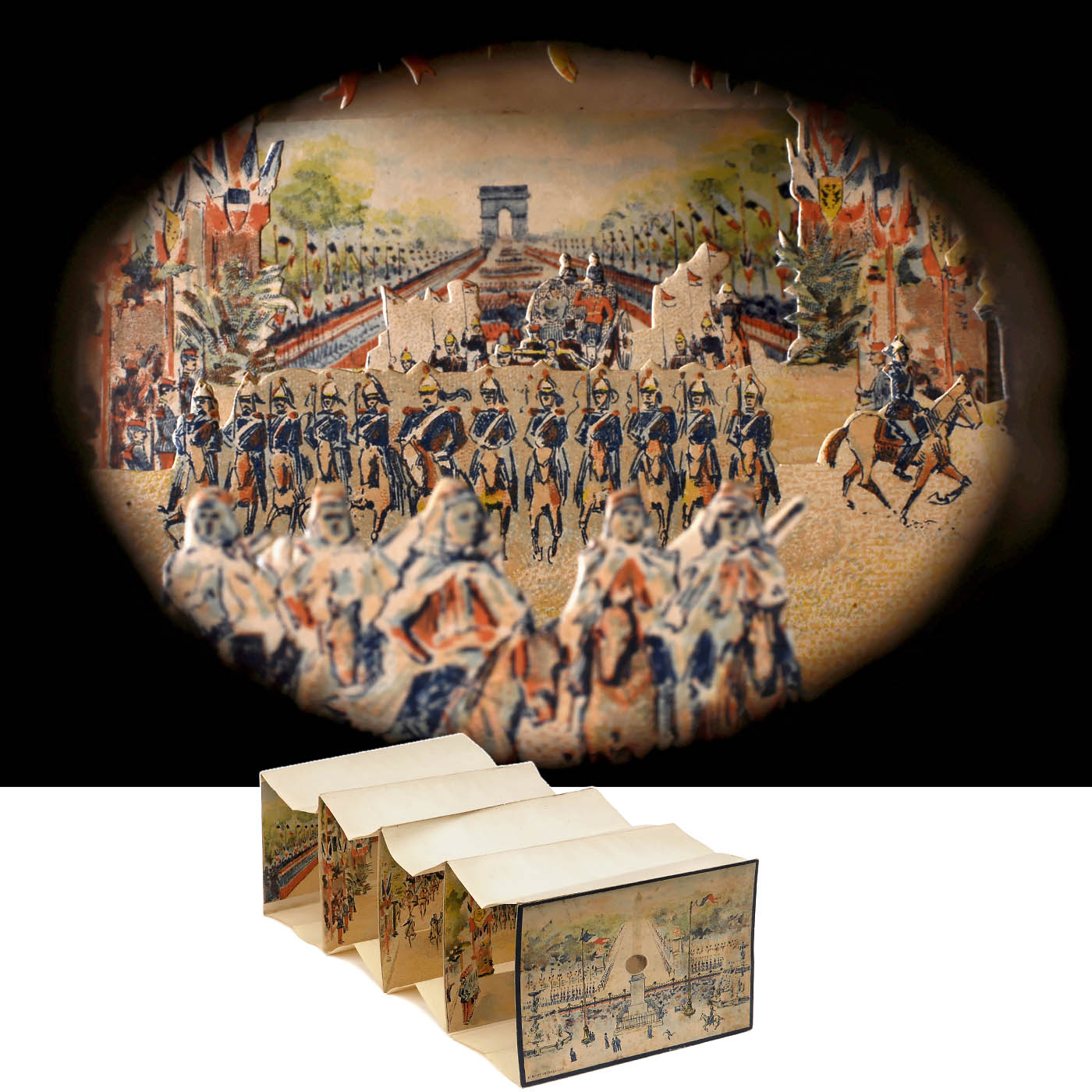 Le Bigot Frères, Lille. One spyhole, 4 sections, size 7 x 4 ½ in., length approx. 14 in., colored lithograph. See: Gestetner Collection, p. 119. Diorama foldable in cardboard box, rear side labeled with "42 60c". Very good condition.