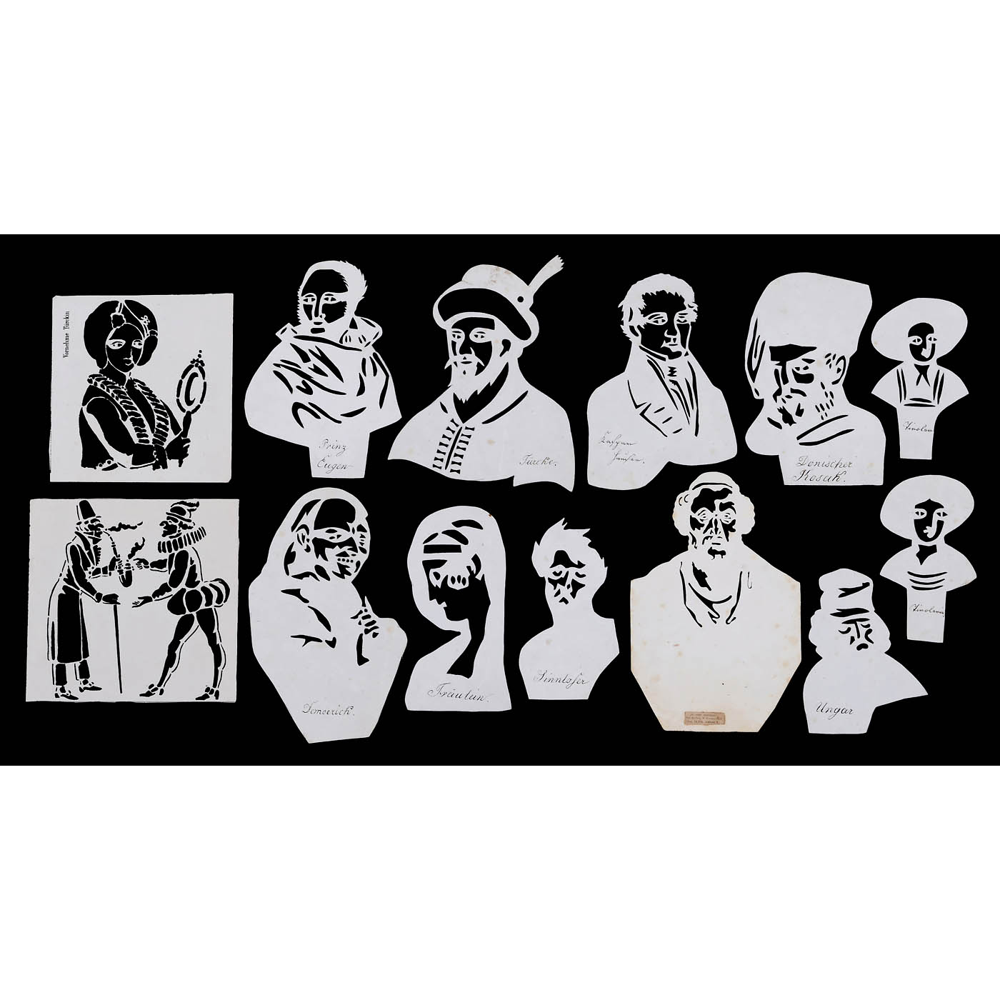 All on white paper, sizes from 2 x 4 in. to 5 x 6 in. Ten are inscribed in German, one printed "Vornehme Tür kin" ("aristocratic Turkish woman"), one unsigned, one with label "Au coq honoré, Rue du Coq St. Honoré No. 7, chez Alph. Giroux".