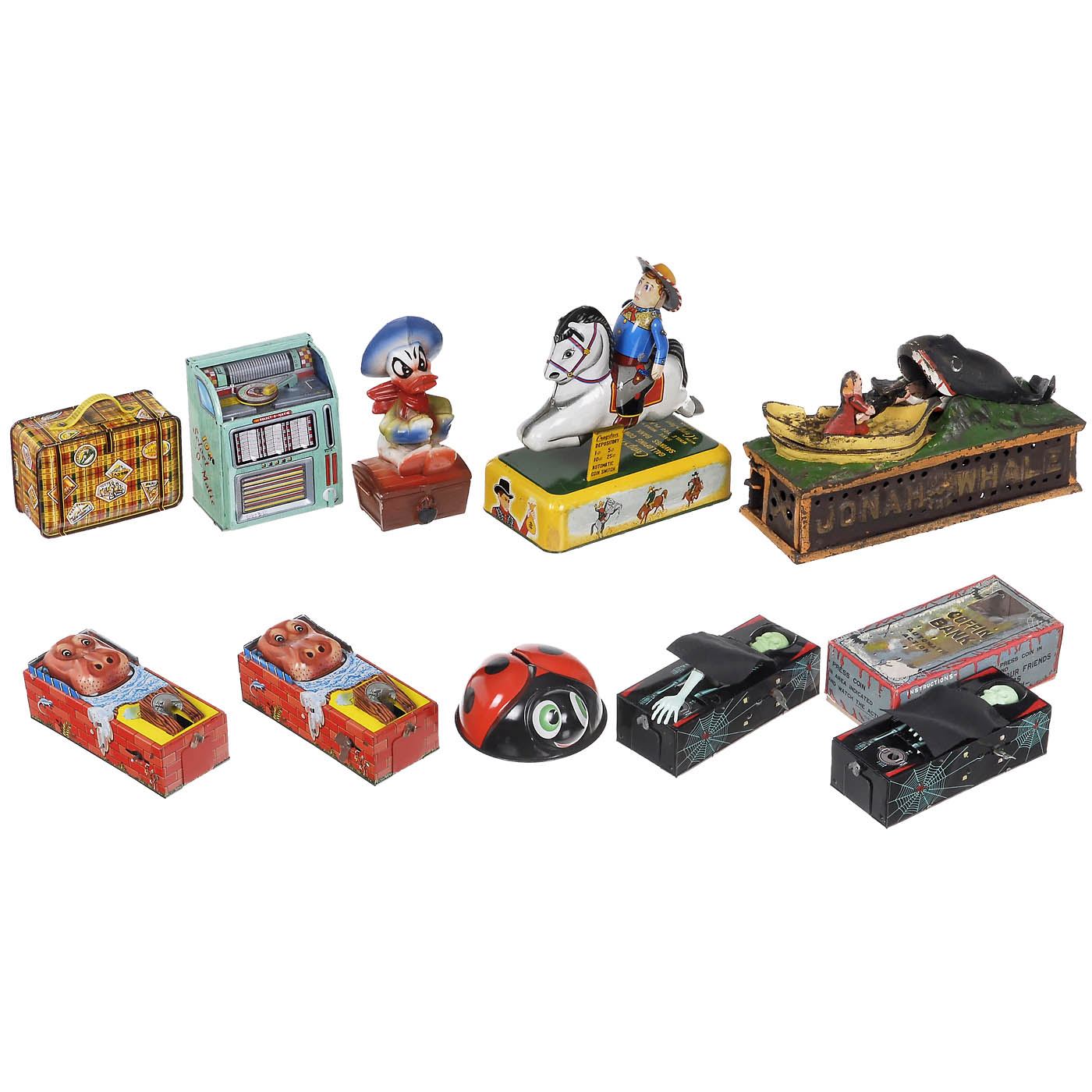 1) Cragstan Galloping Cowboy Savings Bank, Japan, lithographed tin, battery-operated, without battery cover. - 2) 2 x Coffin Bank, Japan, lithographed tin, spring-driven (both working), 1 x with box. - 3) Donald, plastic. - 4) Suitcase, Germany, lithographed tin, without coin compartment cover. - 5) Jonah and the Whale, USA, cast metal, reproduction. - 6) Ladybug, Lehmann, Germany, lithographed tin. - 7) 2 x Hippo Banco, lithographed tin, spring-driven (1 x defective). - And: 8) Jukebox, Haji, Japan, lithographed tin, damaged plastic cover, spring driven (working), with built-in music box.