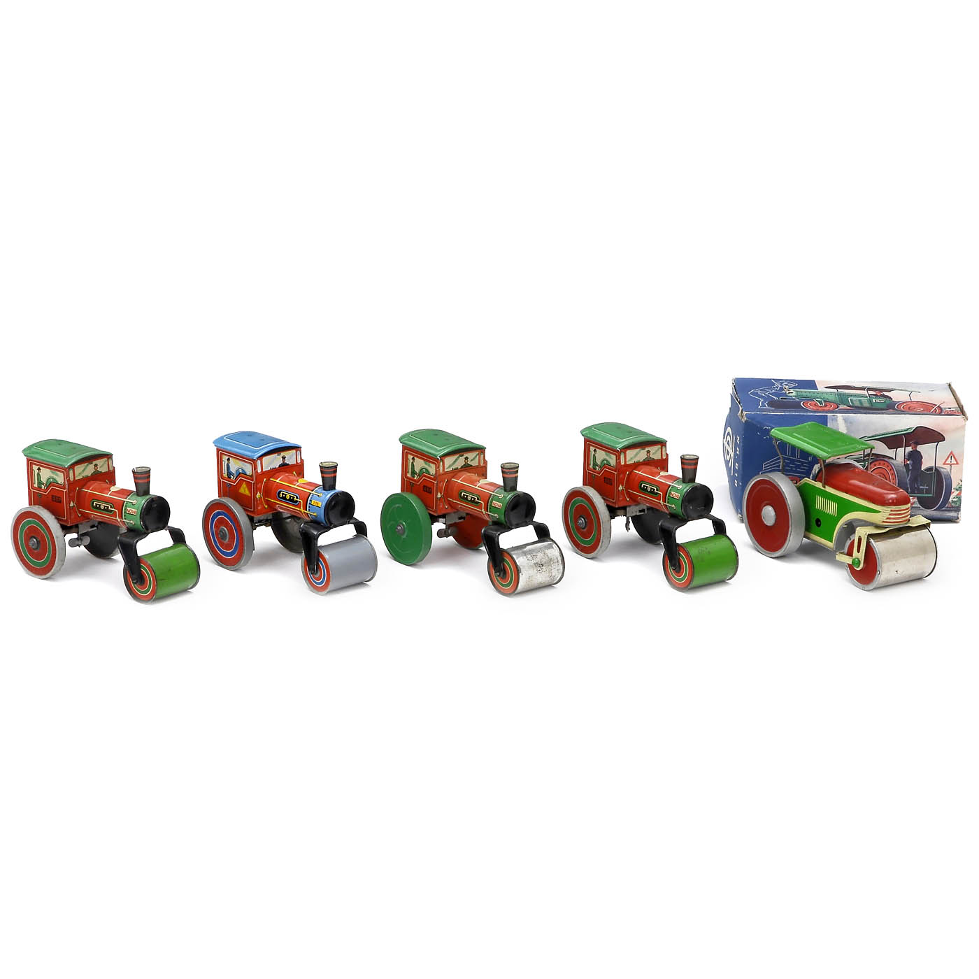 Lithographed tin, spring-driven (all working). - 1) 3 x Nova, no. 237, various colors. - 2) Technofix, no. 278. - 3) Piko, missing chimney. - In addition: Tippco, empty box for no. 610.