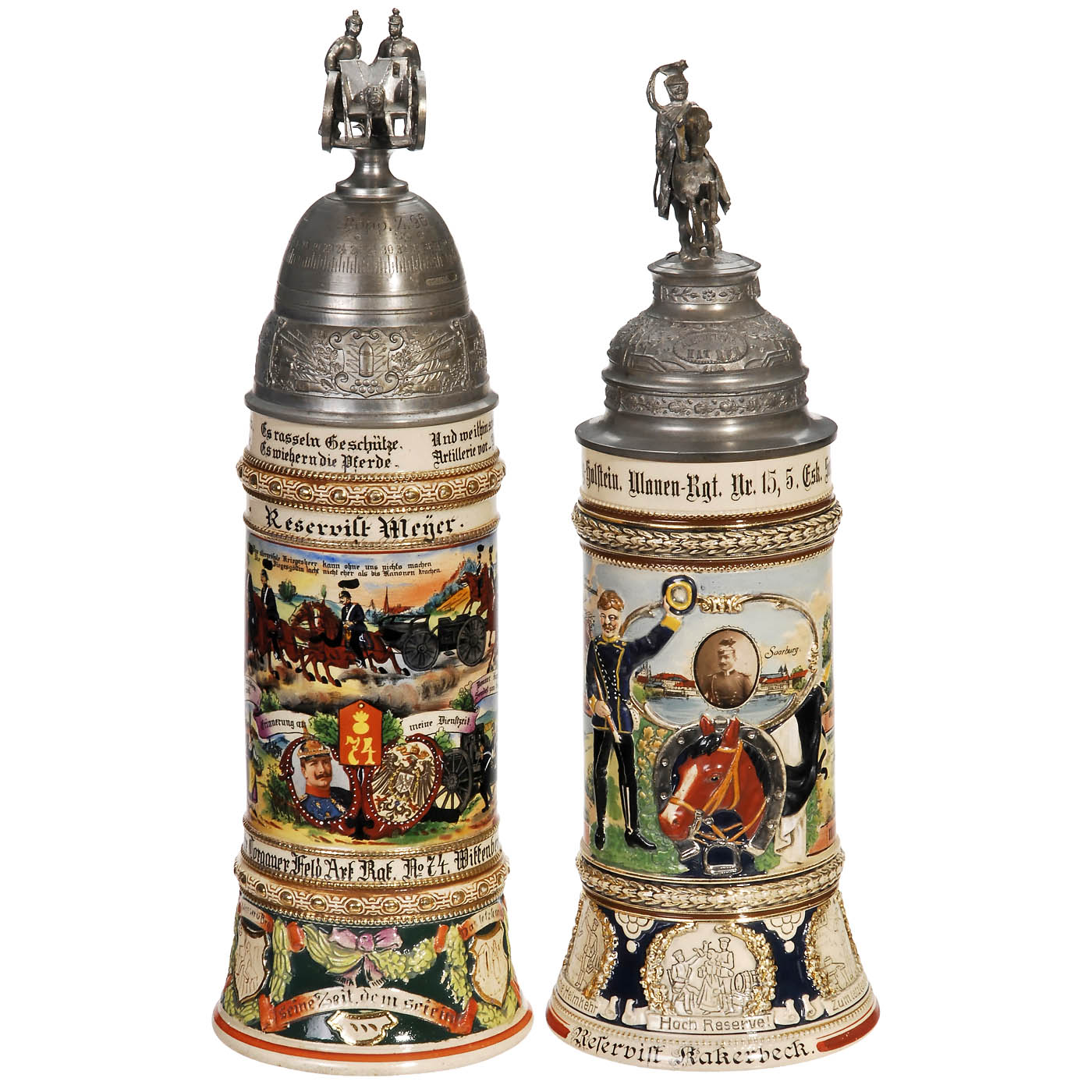 1) "Schleswig-Holstein. Ulanen-Rgt. Nr. 15, 5, Esk. Saarburg". Model no. 5105, ½-liter jug for the Reservist Hakerbeck, 1908-1911. Chromolithographed and hand-painted decoration with relief and gilt highlights, 4 military scenes, with name list, high tin lid with relief, riding Ulan with flag on top, crowned griffin thumblift, total height 13 1/3 in. - And: 2) "2. Reit. Battr Torgauer Feld Art Rat, No 74, Wittenberg". ½-liter jug for the Revervist Meyer, 1911-1914. Chromolithographed and hand-painted decoration with gilt highlights, 3 military scenes, with name list, high tin lid with relief, 2 soldiers at canon on top, rider thumblift, total height 13 ¾ in.