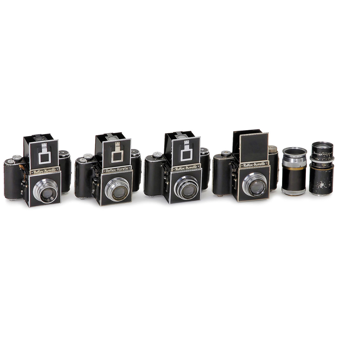 C.F. Foth & Co., Berlin. 6 x 6 cm TLR. 1) Foth-Flex II with Foth-Anastigmat 2,5/75 mm, c. 1936, English exposure guide. (3/3) - 2) Foth-Flex II, Foth Anastigmat 2,5/75 mm, lever for focusing sticks. (3/3-) - 3) Foth-Flex with Foth Anastigmat 3,5/75 mm. Shutter parts missing. (3-/-) - With rare Foth-Flex brochure. - Franz Kochmann, Dresden. 6 x 6 cm SLR. 5) Reflex-Korelle I, c. 1935, Tessar 2,8/8 cm, shutter sticks. (3/-) - 6) Reflex-Korelle I, c. 1935, Radionar 3,5/7,5 cm, shutter without function. (3+/-) - 7) Reflex-Korelle II, Radionar 3,5/7,5 cm, shutter irregular. (3-/-) - 8) Reflex-Korelle II, Victar 3,5/7,5 cm, shutter sticks. (3/-) - 9) Schneider Xenar 4,5/13,5 cm for Reflex-Korelle. (3/3) - 10) Ross, London. Teleros 4,5/9 inch for Reflex-Korelle. (4/3) - And: 11) Focal Press - "Korelle Guide", 72 pages, and instructions for Mod. II and II. - In addition: Spare parts for both manufacturers.