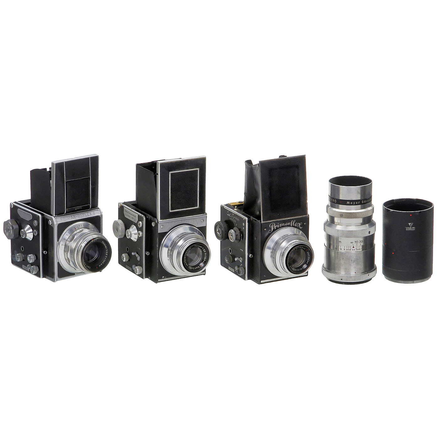 1) Curt Bentzin, Görlitz. Primarflex no. 28194, with Zeiss Tessar 3,5/10,5 cm T no. 3086824, focusing screen with split field, top synchronized, shutter working intermittently. (3-/3-4) - 2) Primar Kamera Werke VEB, Görlitz. Primarreflex no. 30324, engraved "VEB Filmfabrik Agfa Wolfen 920307", Zeiss Tessar 3,5/10,5 cm T no. 3172483, inoperative. (3/4) - 3) Feinopt. Werk Görlitz. Primar-Reflex II no. 36067, with late Zeiss Tessar 3,5/105 mm T no. 3527837, back jammed open, inoperative. (3-/4) - 4) Meyer Primotar 3,5/180 mm V no. 1137680. (3/3) - And: 5) Sperling, Berlin. 3-part macro-tube set. (3/3)