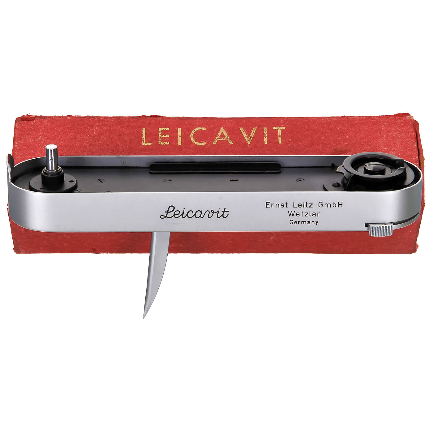 Leitz, Wetzlar. 1) Leica IIIg, no. 870310, without spool, with case. (3+/3) - 2) Leicavit, SYOOM with red (box taped inside at edges). (3/3) - And: 3) Elmar 2,8/5 cm, no. 1454449, c. 1956. Thick dust layer behind front element. With ITOOY sunshade and cap. (3+/4)