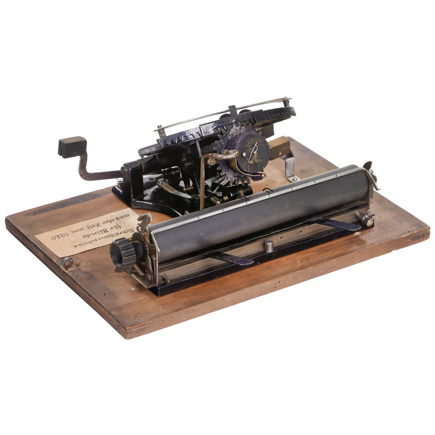 Constructed and manufactured by Georg Emig, Berlin. Extremely rare German typewheel machine with Braille index, 3 wood keys and character strip (copy). Designed for use by the blind and disabled soldiers following the first world war. Production ended in 1926.