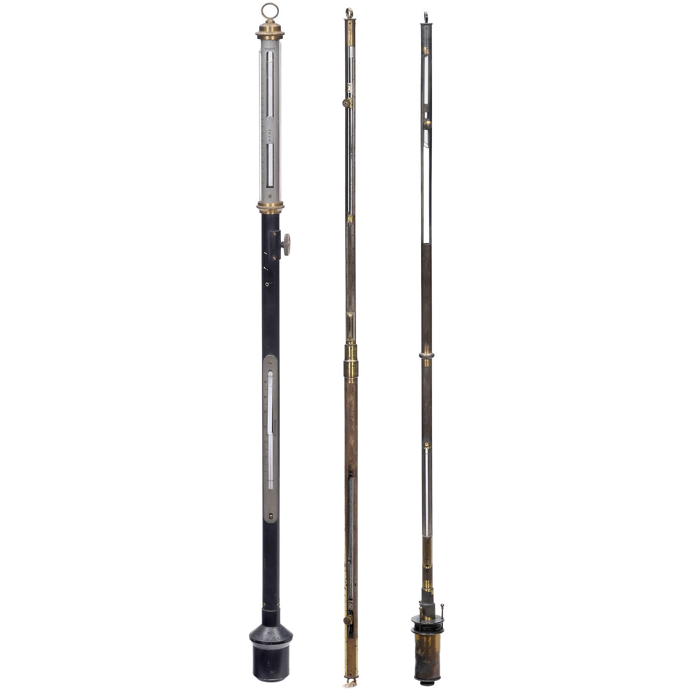 1) Unsigned. Brass, 2 scales (18–40 and 20–43), 2 vernier scales with rack-and-pinion drive, central thermometer (broken glass), total length 37 ¾ in., with leather quiver. – 2) Negretti & Zambra, London. M/6850, brass, partly black-painted, scale from 66–82, vernier scale with rack-and-pinion drive, central thermometer (broken glass), total length 37 2/5 in. – And: 3) Unmarked, brass, heavily damaged, length 37 ¾ in. – No shipping due to mercury.