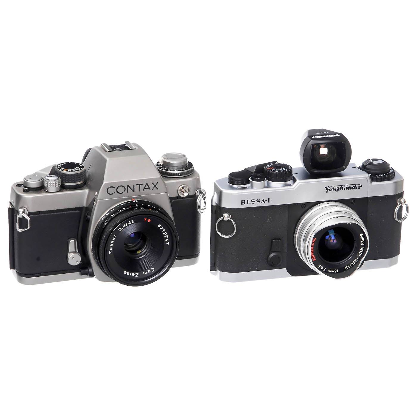 Kyocera, Japan/Zeiss, Oberkochen. 1) Carl Zeiss Tele-Tessar 3,5/200 mm. "Lens made in West Germany". (2/3) – 2) Zeiss Sonnar 2,8/135 mm. (2-/3) – 3) Zeiss Tessar 2,8/45 mm, "Pancake". Popular lens, both for users and for collectors! With guarantee card and information sheet. (2-/2-) – 4) Zeiss Mutar I, 2x teleconverter. (2-/2-) – 5) Soligor mirror lens 8/500 mm, T-2 adapter for Yashica/Contax. (3/3) – 6) Contax S2. (3/3) – And: 7) Voigtländer (Cosina, Japan). Bessa L with Super Wide-Heliar 4,5/15 mm. With viewfinder, strap, instructions and maker's box. The back of the camera needs a new cover. (3/3)