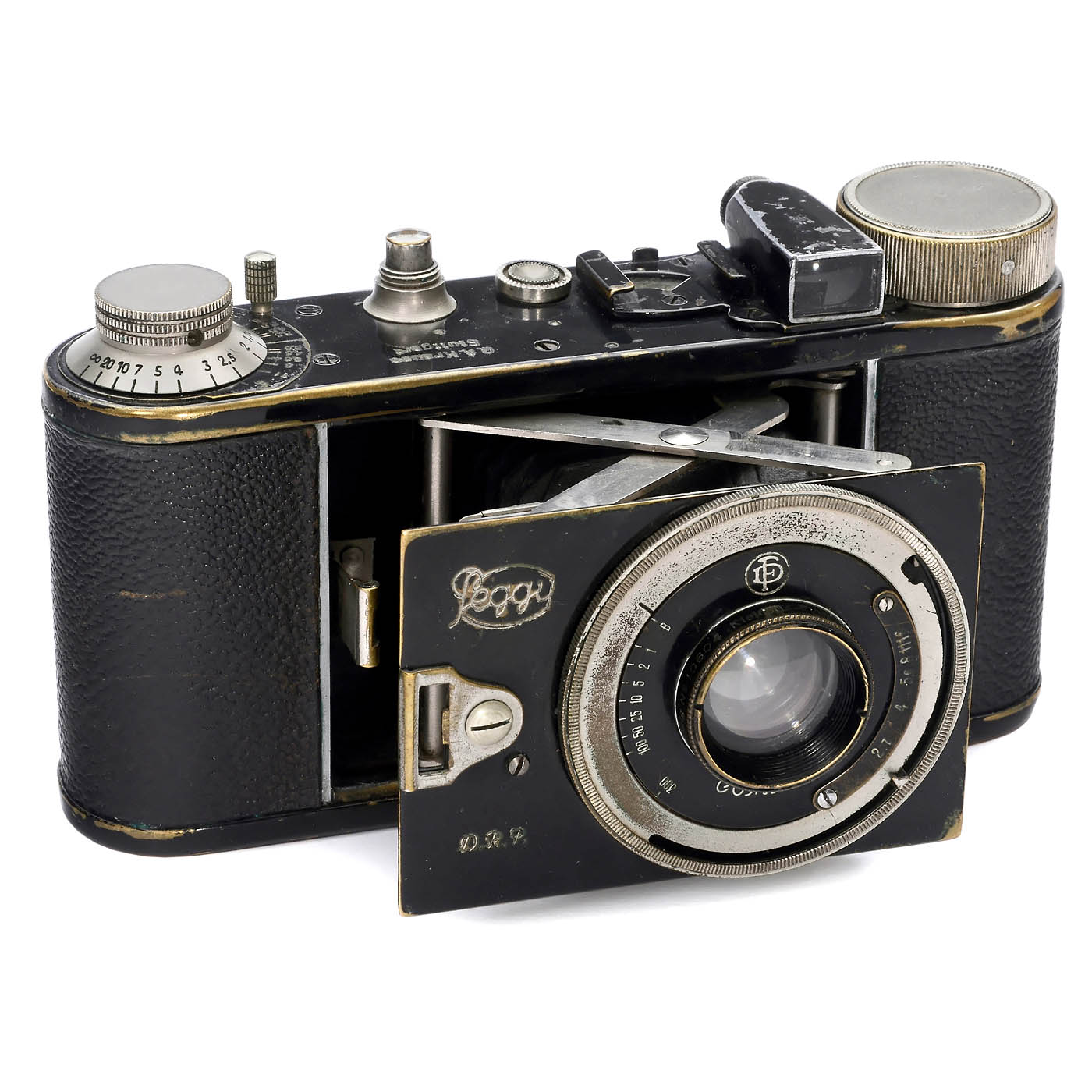 G.A. Krauss, Stuttgart. Peggy Norm, no. B 103/4, 35mm strut camera, with very rare lens "Kleinbild-Plasmat Dr. P. Rudolph DRP 1931 2,7/5 cm sechslinsig No. 10604" (see https://zeissikonveb.de/start/ objektive/wechselobjektive1950er/meyer-optik%20g%C3 %B6rlitz.html). Glass clean, Compur shutter 1–1/300 sec., works. With one original film spool and case. Unusual technique: release button behind the shutter and the shutter tensioned, when camera is stored. Produced for only one year. – The rarest Peggy camera! And in working condition!