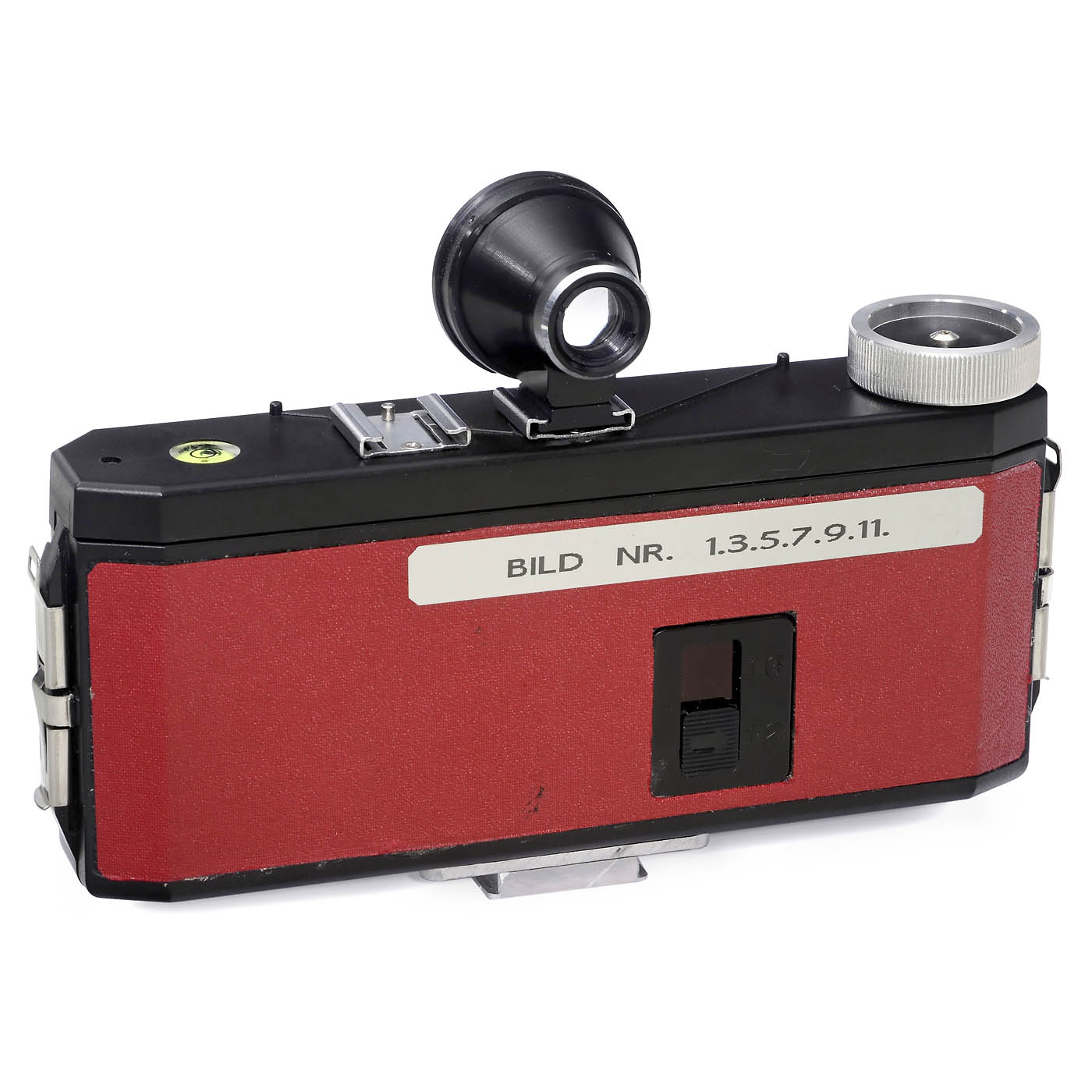 Graumann, Germany. "Lomography" body, modified with two unmarked lenses from Schneider, Angulon 5,6/65 mm lenses modified in Compur-Rapid, synchronized release, fixed focus, spirit level, viewfinder adapted for this format, film transport with film advance knob and windows. – The lenses were measured and adjusted using a collimator. Very light-weight and solid camera of 600 g.