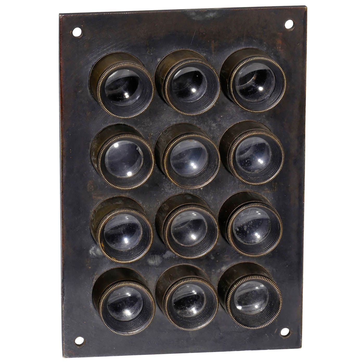 France. Massive, black pickled metal plate of 82 x 118,5 mm, with 12 identic Petzval lenses 4,5/50 mm in brass sliding sleeve, image size 36 mm diameter, very good edge definition and no curvature of field, all lenses can be moved, all interior parts can be screwed. On 2 of the 12 front-lens achromats cracks on glass corner. For 2 x 2 cm on 7 x 10 cm plate. For historians: only 3 of the 12 lenses were cleaned by us. See cover photo of our auction 10/2007, catalog no. 284. Very rare for this small size! Something really sharp for a modern digital camera!