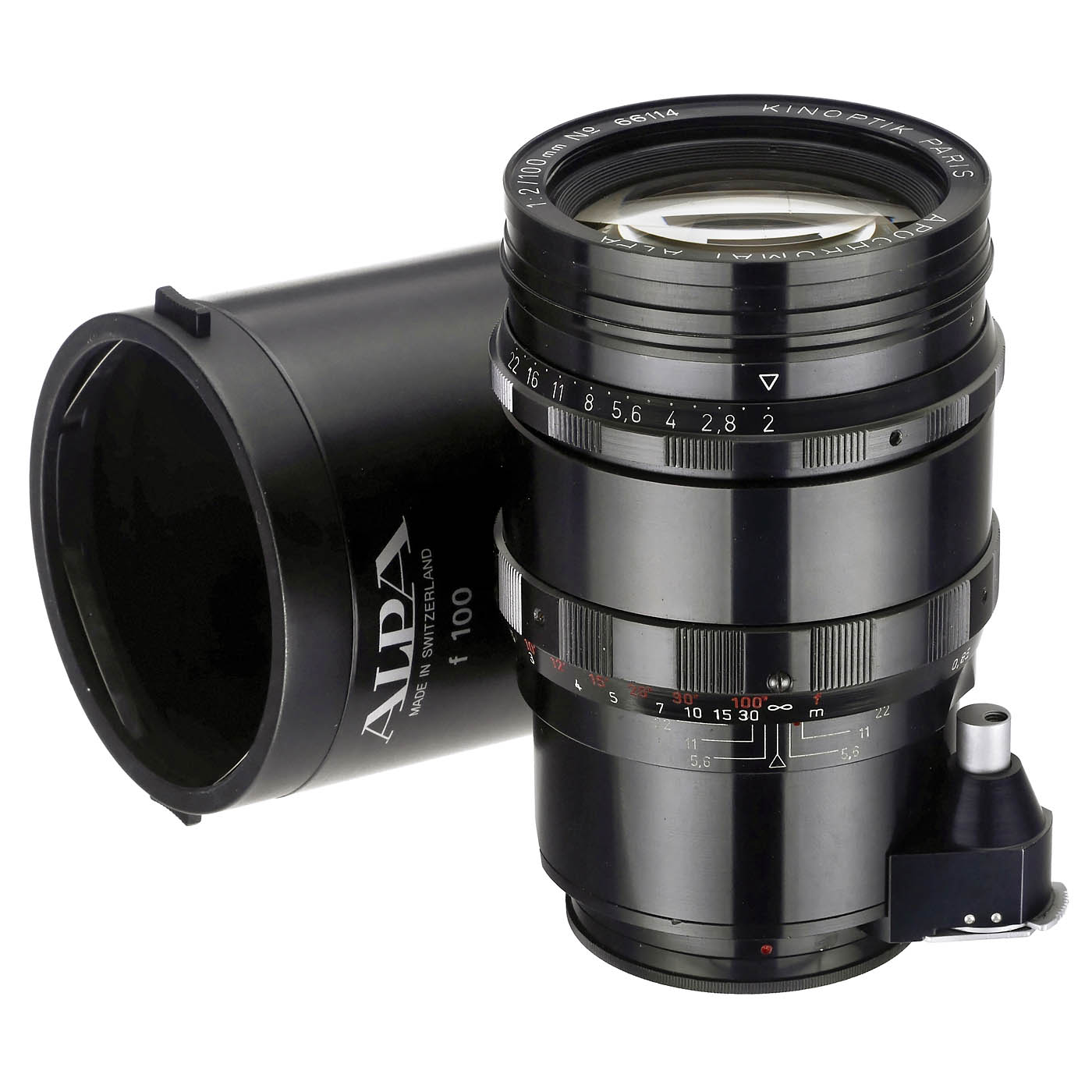 Kinoptik, Paris. No. 66114, for Alpa, glass clean, with Alpa sunshade f 100 and back cap. – A perfect lens in mint-like condition!