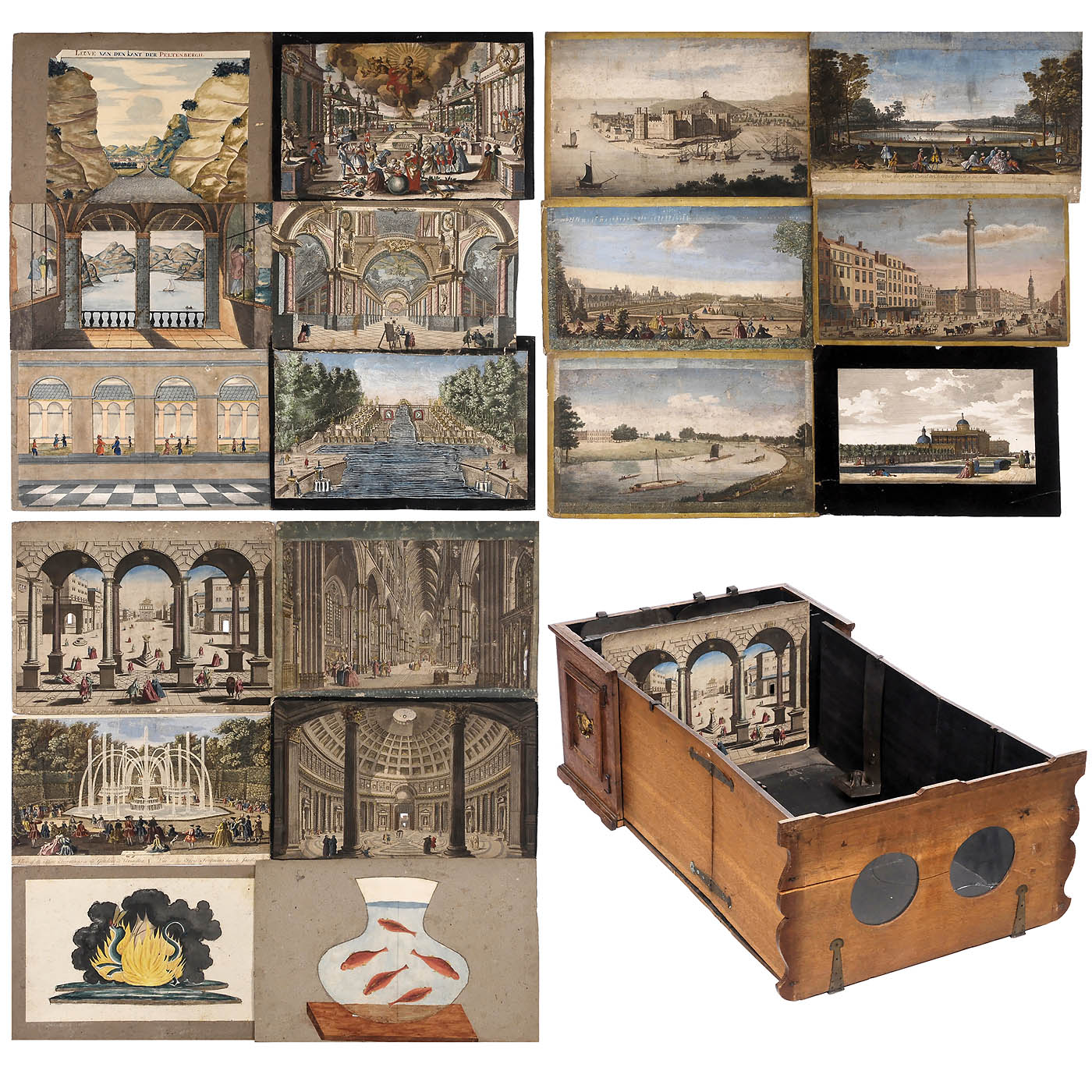 Vues d'Optique of the time 1780–1850. 1–4) Cardboards colored with cut-out for original water color paintings in sizes 28 x 45 up to 31 x 45 cm: the bird Phönix in the fire, Turkey, Peltenbergh and goldfish bowl. Good condition. (3/–) – 5) Cardboard 28 x 45 cm with hand-colored copperplate as flat for cut-out for original water color paintings: a lake in the mountains. – 6–14) Hand-colored copperplates, with pin-prick and cut-out light effects. Size 31 x 44 to 25 x 44 cm: Fountains in the parc of Versailles, water cascades, goodness Venus comes from heaven (on back titled: La Venus, sixième Planete, et son influxion. Med. Fol. No. 55), cathedral and tower of Pisa, library of Vatican, interior of the Pantheon, triumphal arch in Rome, interior of a cathedral and of St. Paul´s cathedrale London. Mostly good condition. – 15–30) Hand-colored copperplates, sizes from 48 x 33 to 41 x 26 cm: Potsdam, Leipzig, Rome, London, shipper by Kent, Chantilly, Palmyra, townhouse of Paris and others. Mostly normal condition. – And: 31) Replica of an unfinished peep-show box, 52 x 29 x 31 cm, folders apart: 52 x 92 x 31 cm, with 4 lightholders and 2 holders for scenery. In front 2 viewing lenses diameter 12 cm, F = approx. 80 cm, with slider for transport protection, on back an opening of 24 x 14 cm for transparent pictures.
