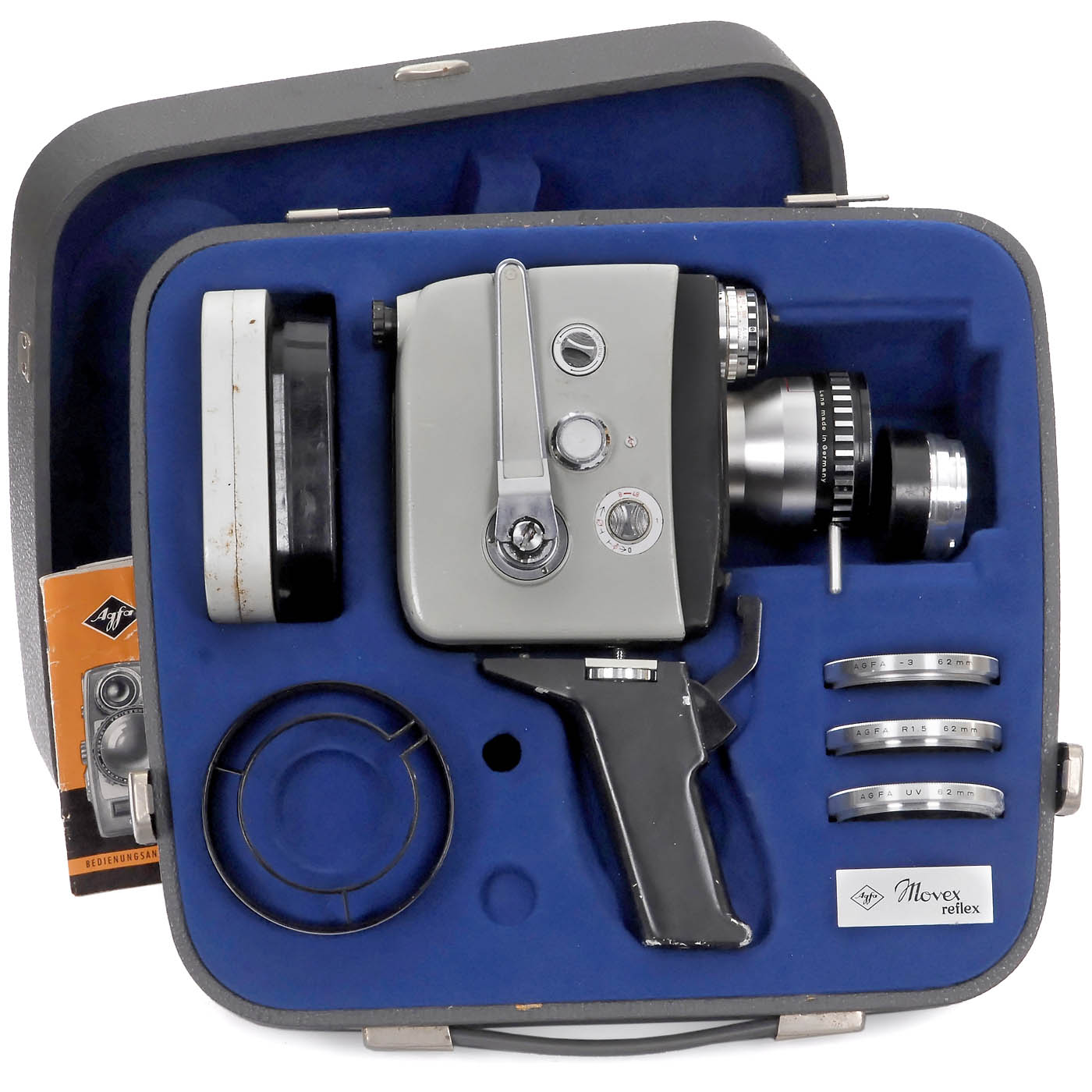 1) Agfa. Movex Reflex Type 5142, for 16 mm on special cassettes. With zoom and standard lens in case, with instructions. Works. (3-/3) – For double-8 film on 7.5m spools: 2) Bolex Zoom Reflex P2 with Pan-Cinor 1,9/9–30 mm. (3/3) – 3) Nizo with 2 lenses and Nizo-titler mod. SH. (3-/3) – 4) Nizo projector Visacustic no. 70, with copy of instructions. Function not tested. Very rare projector! (3/–) – 5–9) Film cameras Eumig C3, Yashica-8-E III, Bauer 88L, Bauer 88F and Bauer 88G. (3/3) – And: 10–11) Bauer 88F and Pentaka 8. (4/–) – In addition: Pathé Baby projector for 9.5 mm. (4-/3-)