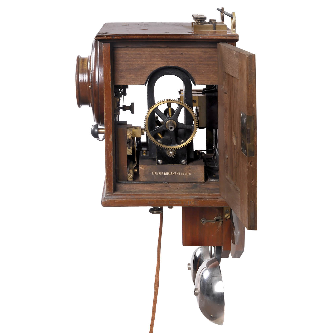 1) M85, walnut case by Gebrüder Naclo, Berlin, no. 2105, mechanical parts by Siemens & Halske, 3-part crank inductor, carbon barrel microphone (renewed), double bell, spoon-shaped receiver by Siemens & Halske. This telephone was rebuilt by RTV in 1895. – And: 2) Siemens & Halske, c. 1905, walnut case, microphone with speaking horn, spoon-shaped receiver, 2-part crank inductor.