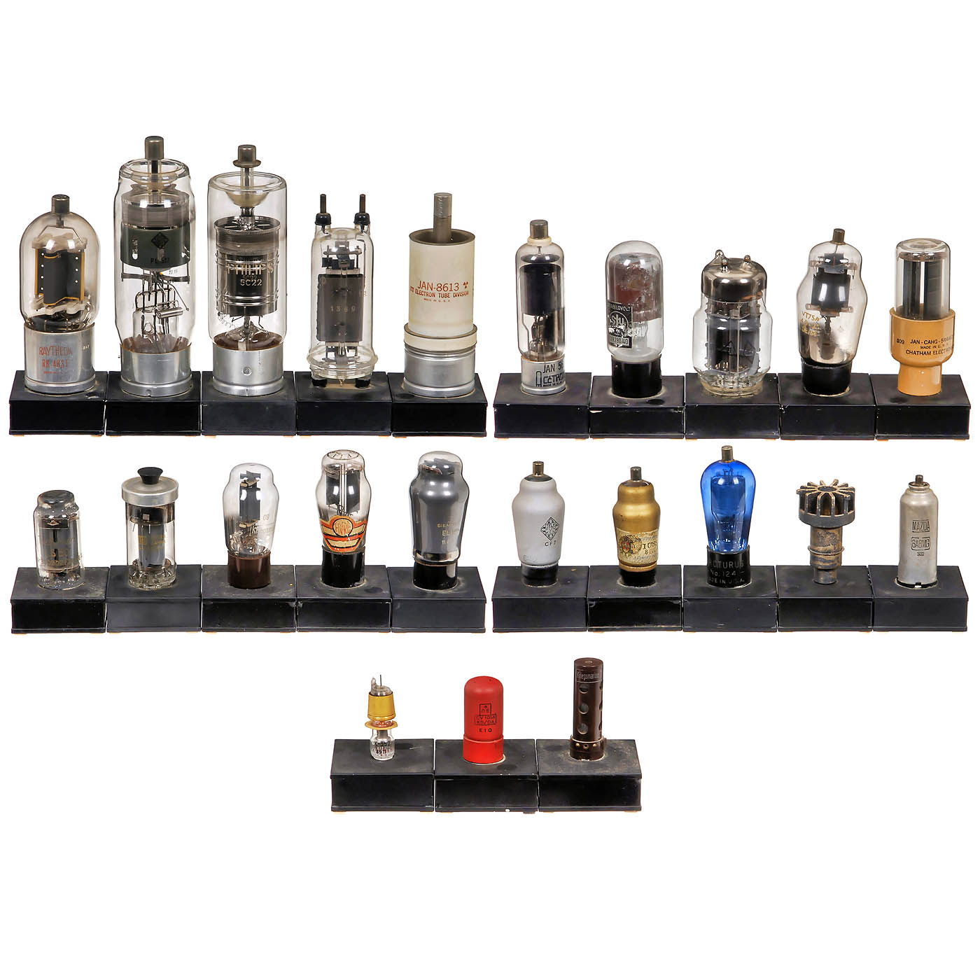 1) Telefunken PL 522, thyratron. – 2) Telefunken RL12T15, transmission triode, navy. – 3) Philips 5C22, thyratron. – 4) Telefunken CF7, pentode. – 5) 6C33C-B, triode, USSR. – 6) Stabilovolt STV280/40, glow voltage divider. – 7) Raytheon RK-4B31, half-wave rectifier. – 8) Mazda 6A8MG, heptode. – 9) Siemens EL12, pentode. – 10) General Electric CV1054, diode. – 11) K-352, reflex klystron, USSR. – 12) Philips KF4, pentode. – 13) Arcturus 124, screen grid tetrode. – 14) Unitra Lamina GU-50, pentode, USSR. – 15) Chatham Electronics 5R4WGY, two-way rectifier. – 16) ITT JAN-8613, thyratron. – 17) VT75A, tetrode, United Kingdom. – 18) Telefunken RL2T2, triode, navy. – 19) Telefunken LS50, pentode. – 20) Acetron JAN 5684, thyratron. – And: 21) 3 more tubes.