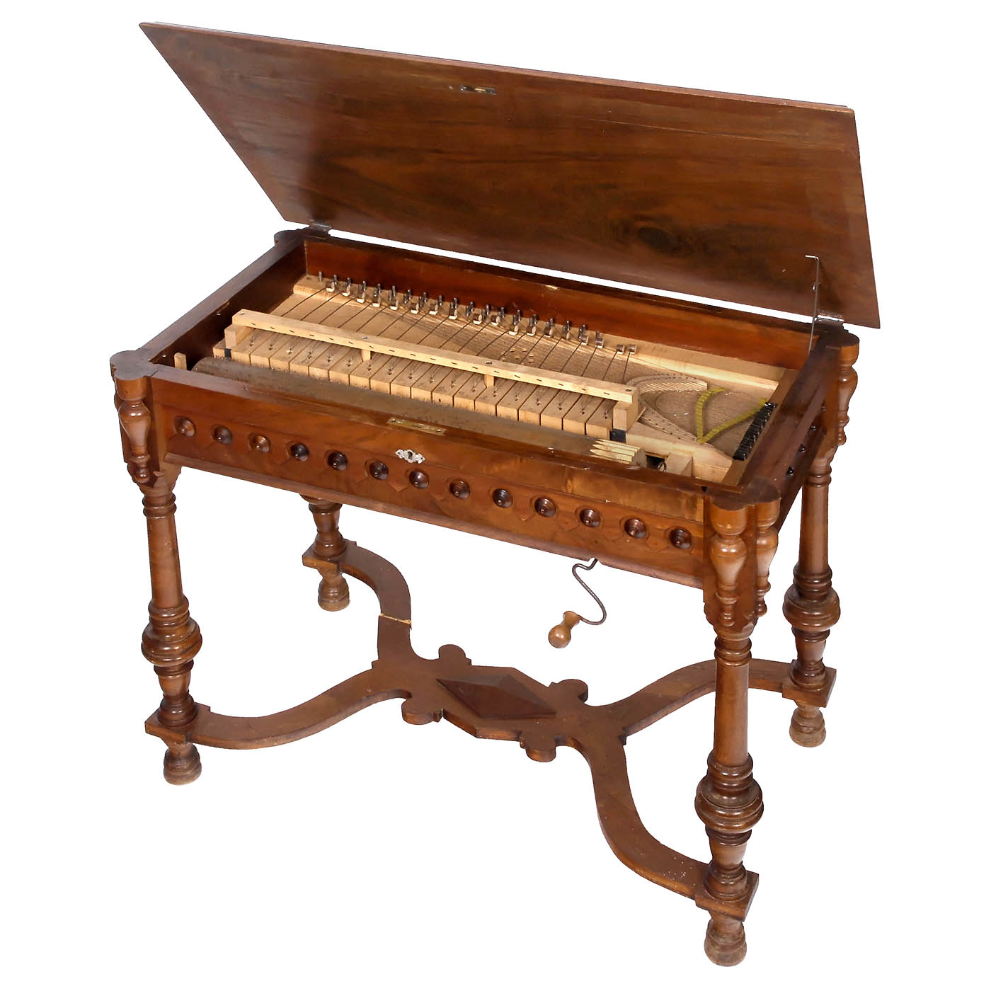Sweden, hand-cranked barrel-operated piano, 18 notes, 12-tune pinned barrel of approx. 25 1/2 in., size of case 38 x 21 2/3 x 29 1/2 in., turned legs, working condition but needs tuning.