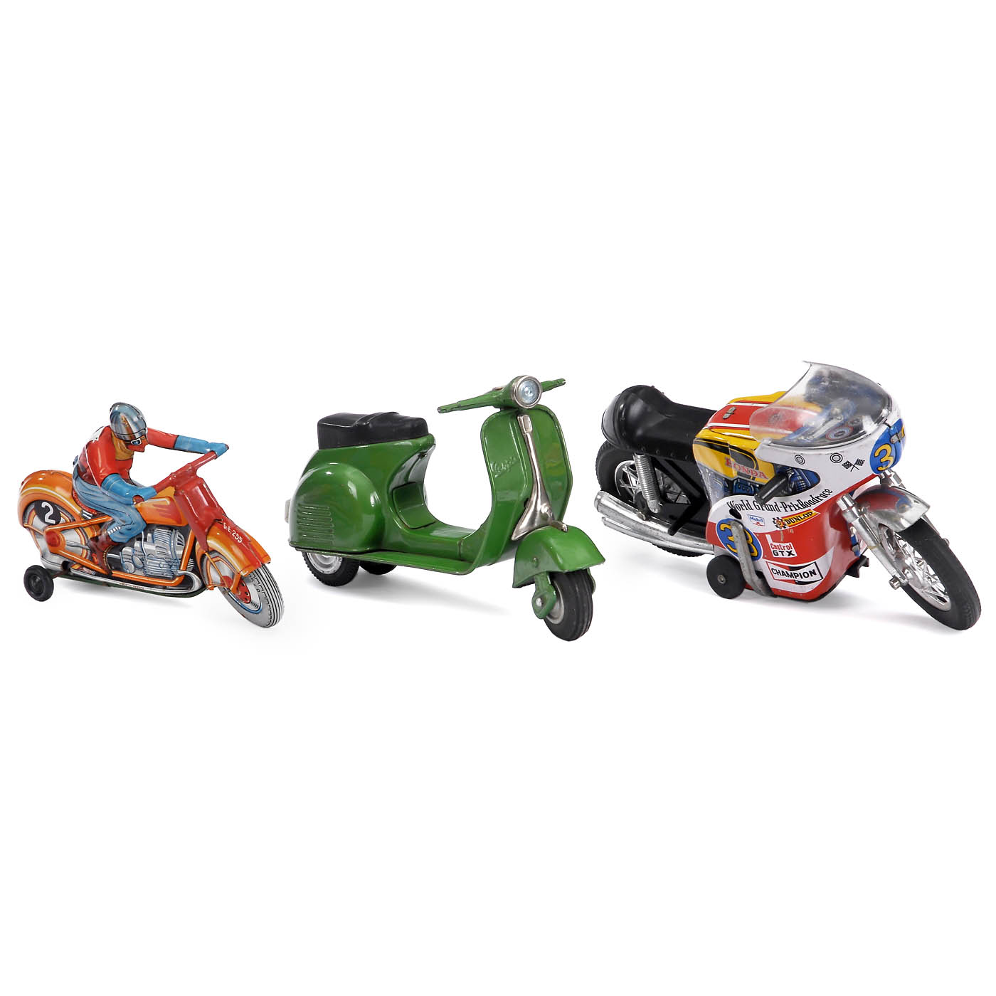 Lithographed tin. 1) PN200, c. 1955, Philipp Niedermeier, Nuremberg. The rider performs a handstand. Spring defective, length 6 ¼ in. – 2) MS-359, China, c. 1995, spring drive working, length 8 ½ in. – 3) MS-702, China, c. 1990, spring drive working, length 7 in. – 4) Unmarked, spring drive working, length 8 ¾ in. – 5) GE 255, Technofix, c. 1970, Made in France, spring drive working, length 7 in. – 6) Grand Prix motorbike, c. 1985, TPS, Japan, battery-operated (untested), length 10 ¼ in. – And: 7) Vespa, c. 1960, Bandai, Japan, friction-driven, length 8 ¾ in.