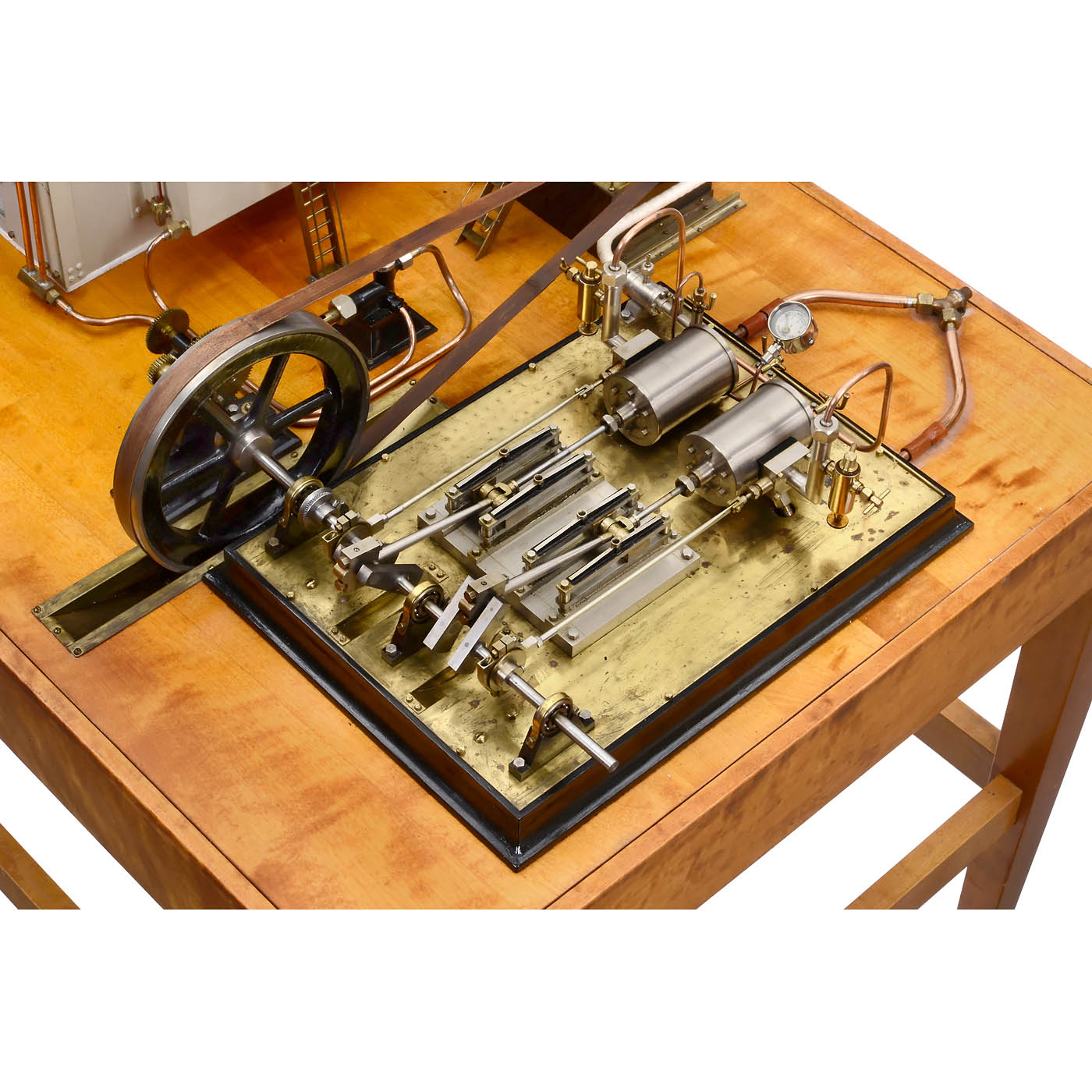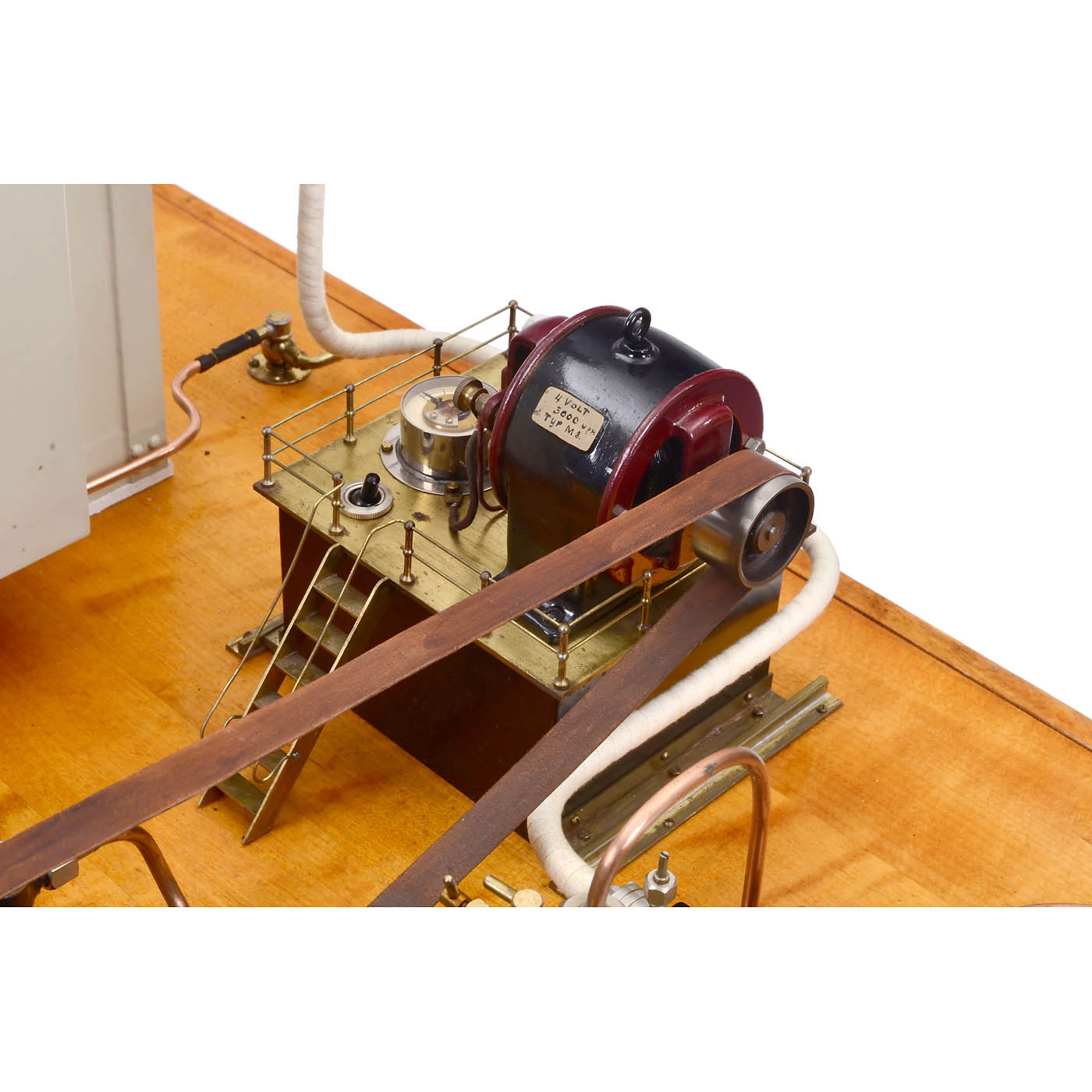 Type Porcupine, no. 1495, builder: Arvid Öhlin, large boiler house, dimensions 15 ¾ x 9 ½ x 12 ¾ in., double-flame spirit burner with pressure vessel, boiler length 13 in., Ø 4 4/5 in., with water level glass, drain cock, manometer and steam whistle, 2-cylinder steam engine on brass baseplate, cylinder length each 2 ½ in., Ø 1 ¾ in., slide control, rods with crosshead guide, large flywheel, Ø 6 ¼ in., 4-volt dynamo with belt drive and voltmeter, feed pump, revolution counter, on birch wood frame with 5-sided glazed cover, overall dimensions 32 1/3 x 25 x 53 in. – An excellently constructed model in museum quality.