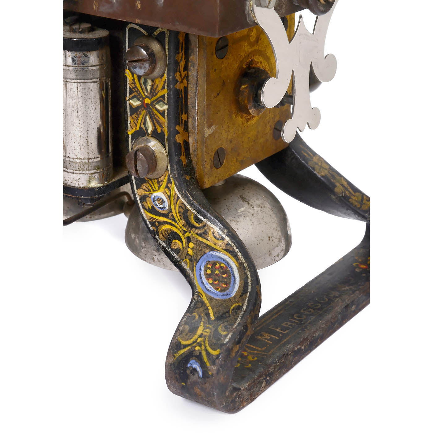 Transfer-decorated base marked: "L.M. Ericsson & Co., Stockholm", swiveling microphone support, carbon-granule transmitter, Bell-type earphone, double-bell, lightning protection, handcrank. Very good original condition.