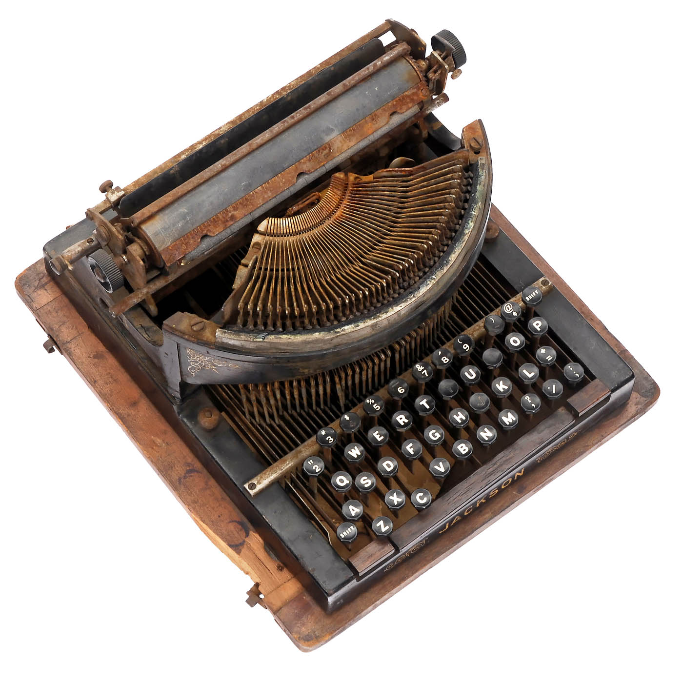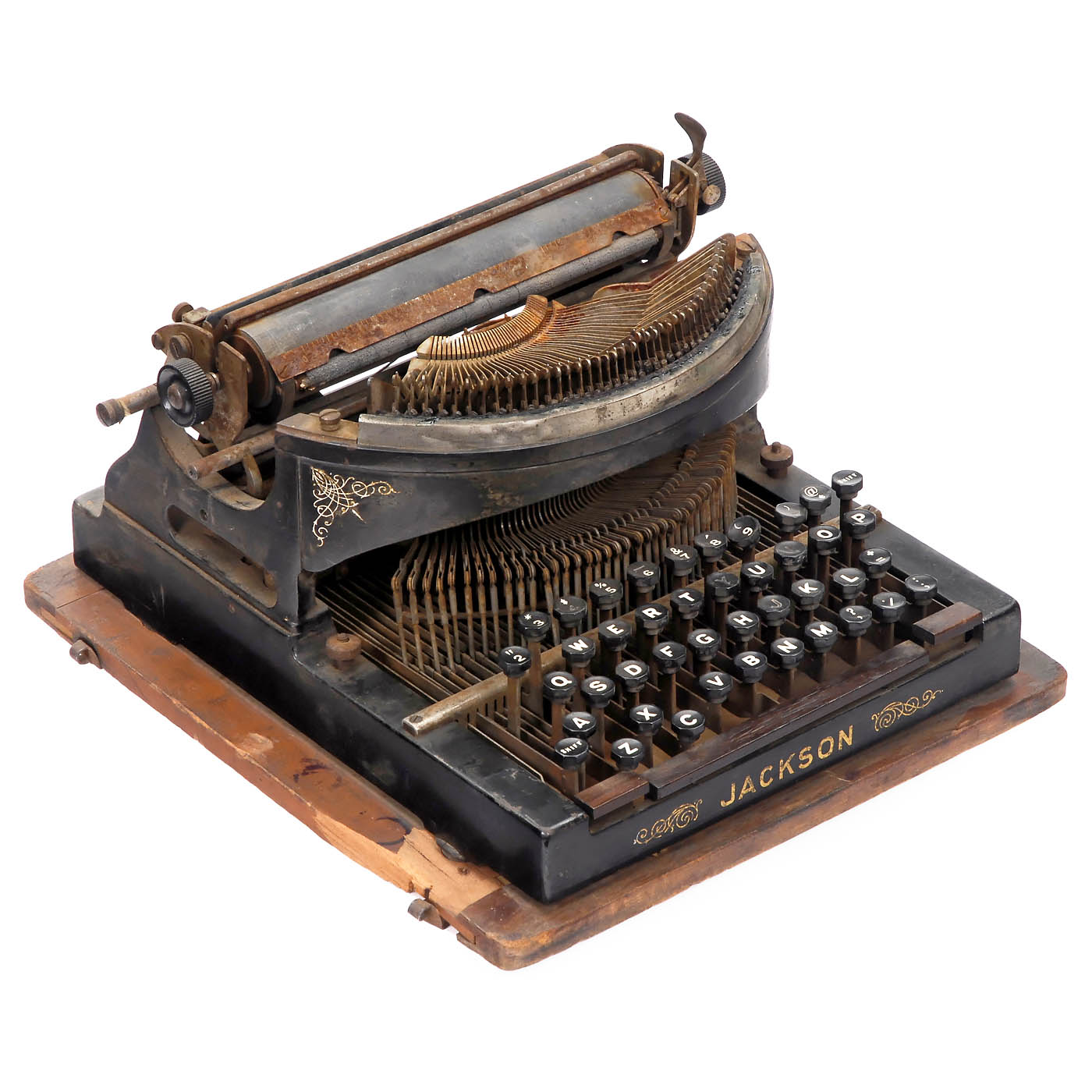 Joseph Hassel Jackson. Serial no. 547, American "Grasshopper-action" typewriter with nickel-plated maker's plaque: "Patented Jackson Typewriter, Boston, Mass.", attractive decoration, complete but partially rusty. - Literature: P. Lippman, 1991, p. 110 and https://site.xavier.edu/polt/typewriters/ jackson.html - A rare machine, one of few units produced, worthy of restoration.