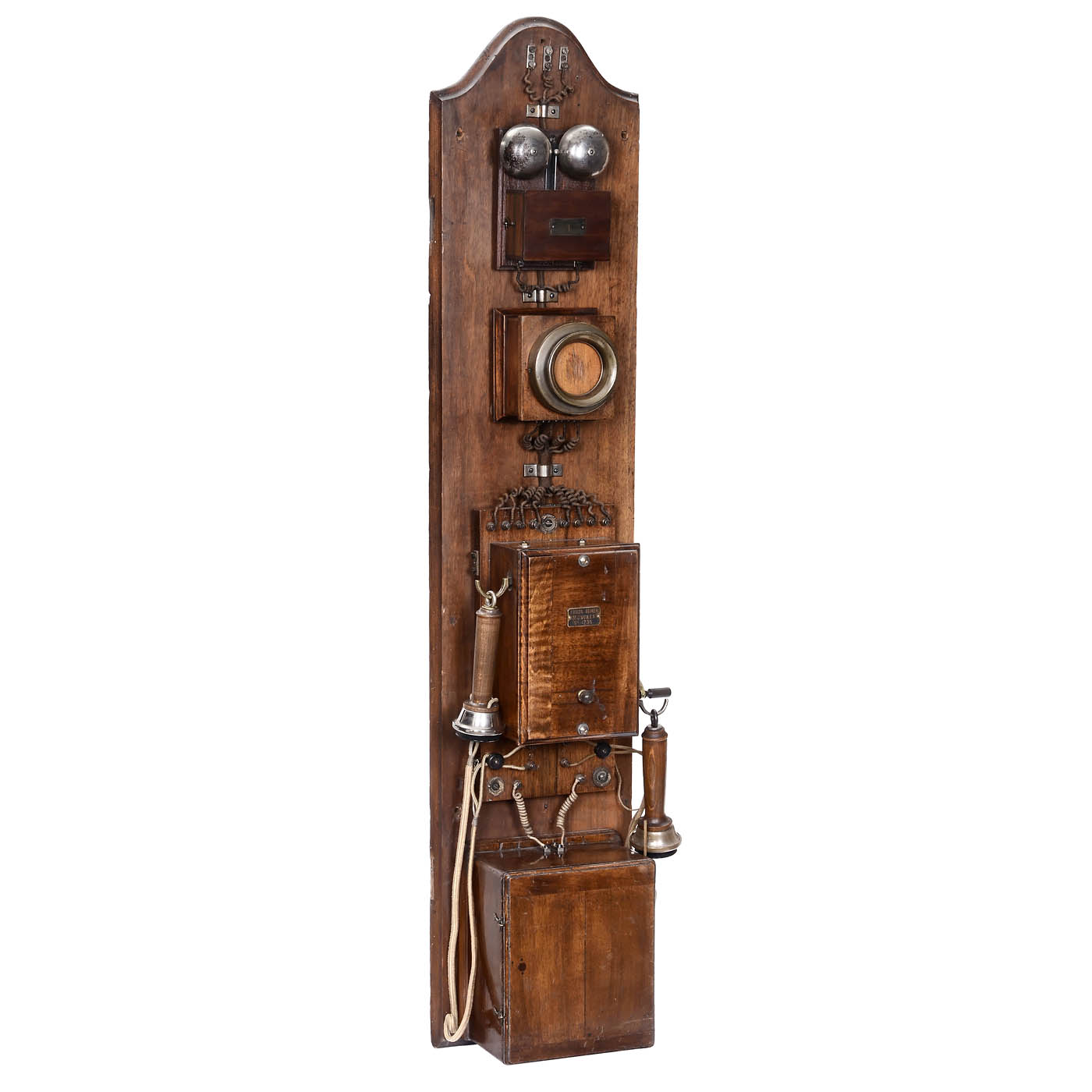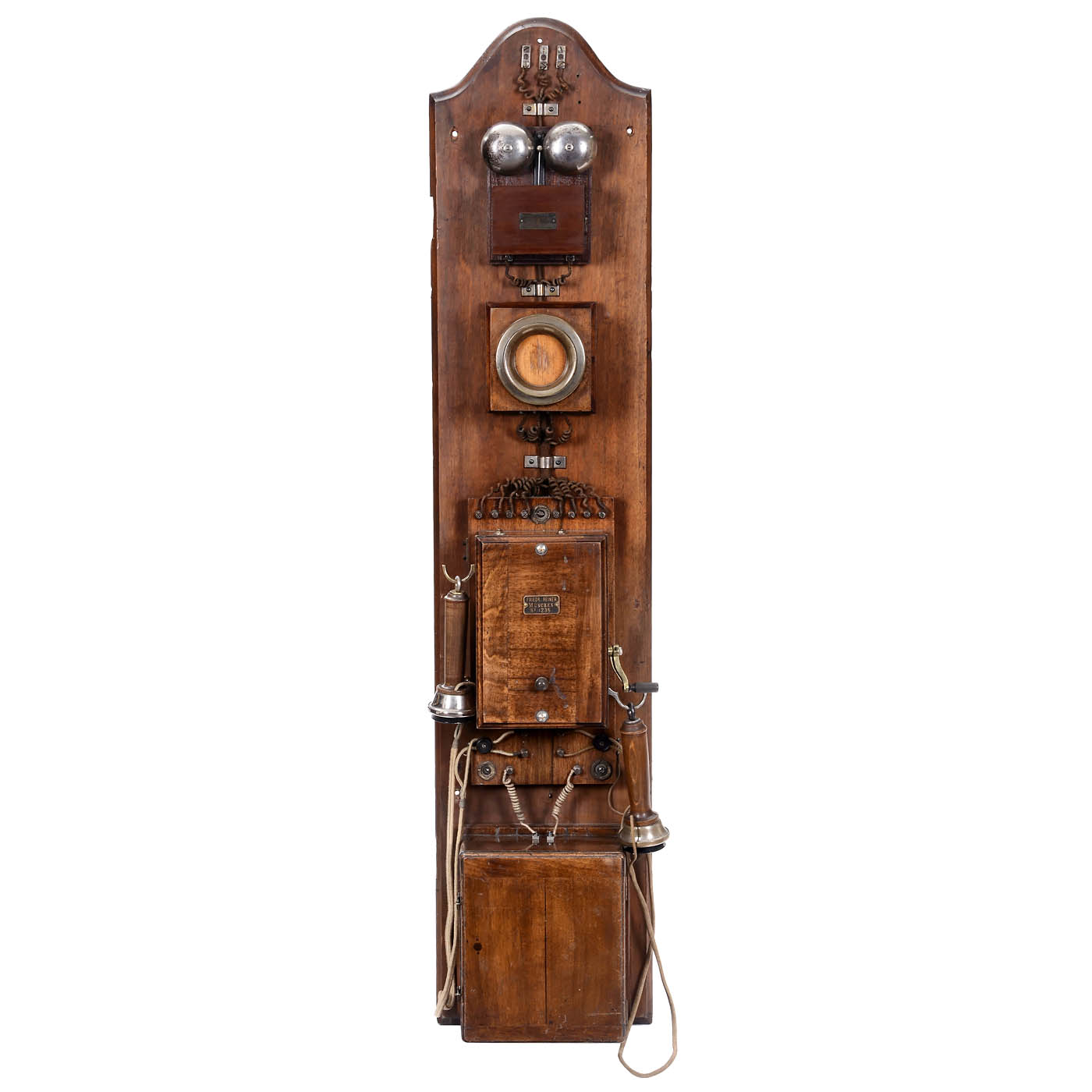 Friedrich Reiner, Munich. No. 1235, standard model of the "Generaldirektion der Königlich Bayerischen Posten und Telegraphen", polished walnut cases, station consisting of: early carbon-barrel microphone with wood membrane, main case with three-part crank inductor and switch, 2 Bell-type earphones, double bell and battery case with chromic acid cell, overall height 51 in. - Restored.