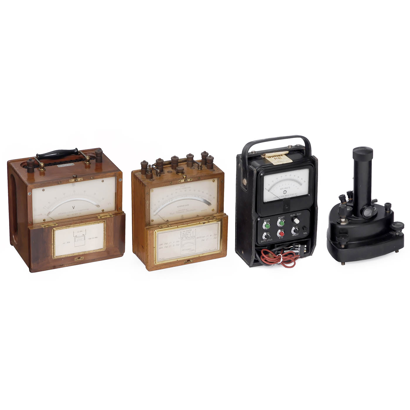 1) Ermi YBL 10, for settings in the microvolt range, dimensions 26 1/3 x 13 ¾ in., with Ericsson laboratory inventory number. - 2) Large voltmeter, Hartmann & Braun, with Ericsson laboratory inventory number. - 3) Duty cycle meter, Burroughs, in leather case. - 4) Multimeter, Inkavi, in leather case. - 5) Mirror galvanometer, Siemens & Halske, height 9 ½ in. - 6) Luxmeter, Germany, complete with instructions, in wood case. - 7) Large voltmeter, Hartmann & Braun, up to 40 volts, walnut case, with Ericsson laboratory inventory number. - 8) Counter induction coil, The Cambridge and Paul Instrument Company, mahogany case, with Ericsson laboratory inventory number. - 9) Megaohmmeter, (insulation tester), Ermi, Sweden, in oak case. - 10) Voltmeter, probably Hartmann & Braun, up to 150 volts, walnut case. - And: 11) Universal terminal, bench-built.